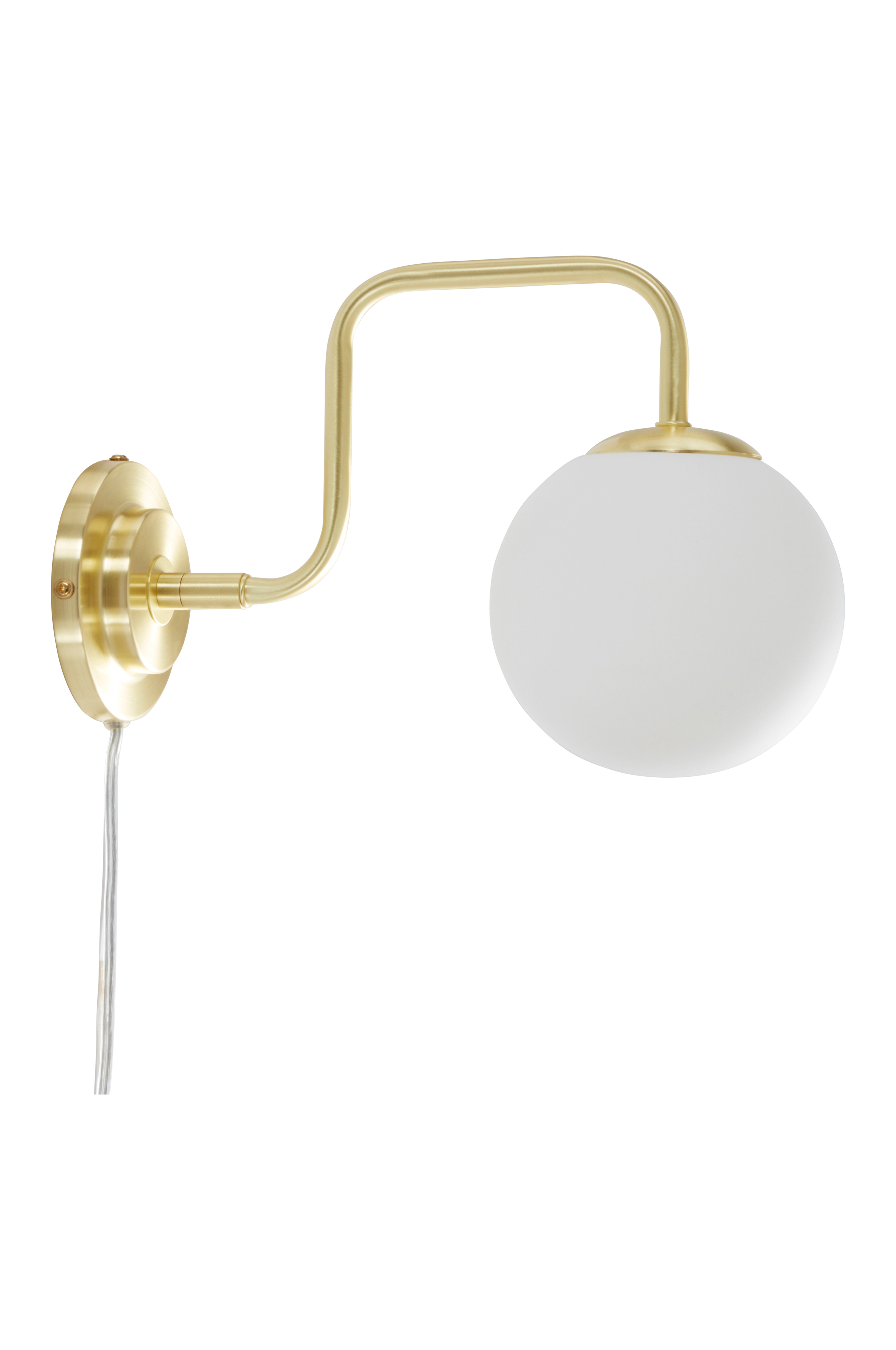 Vegglampe av metall med rund kuppel av opalglass. Det pent formede festet gir lampen herlig karakter, og den er en fin blanding av moderne og gammeldags. Lampen kan monteres vendt oppover eller nedover, noe som gir lampen ulike uttrykk. Lampen er pen i gangen ved siden av speilet eller som skrivebordlampe eller sengelampe over nattbordet. Ledningen er transparent, og strømbryteren sitter på ledningen.