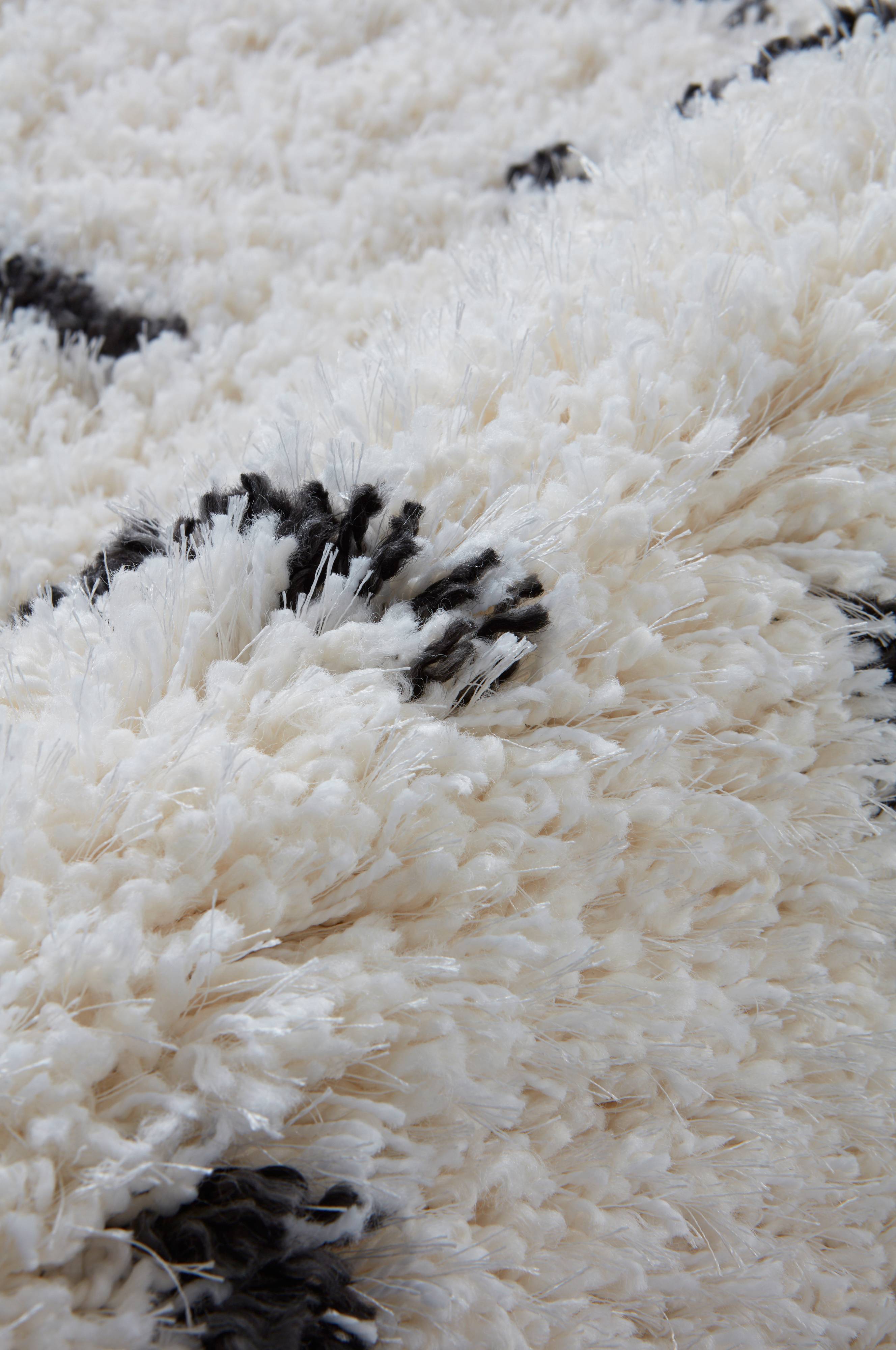 Luggteppe med uregelmessig stripemønster på lys bunn. Teppet har tett, deilig lugg med en tynn, blank tråd iblandet i et mykt, luftig garn. Teppet er deilig å sitte på samtidig som det demper lyd, og passer perfekt på barnerommet. Lugghøyde 4,5 cm. Tykkelse 5 cm. 2700 g/m².
