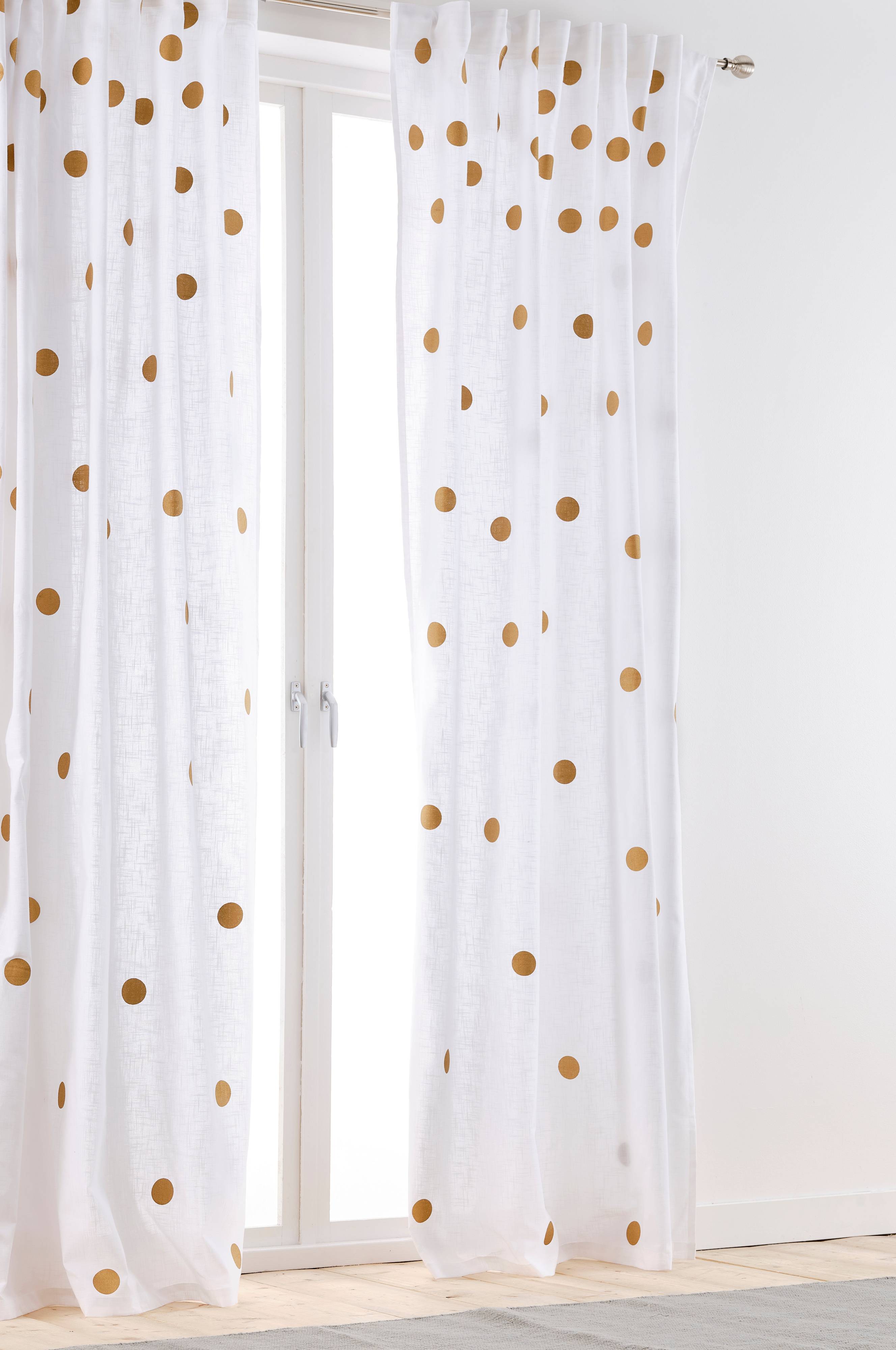 2-pk gardinlengder i bomull med trykt, prikkete mønster og påsydd multifunksjonsbånd. Gardinen kan henges opp med fingerkroker, kanal eller skjult hempe.