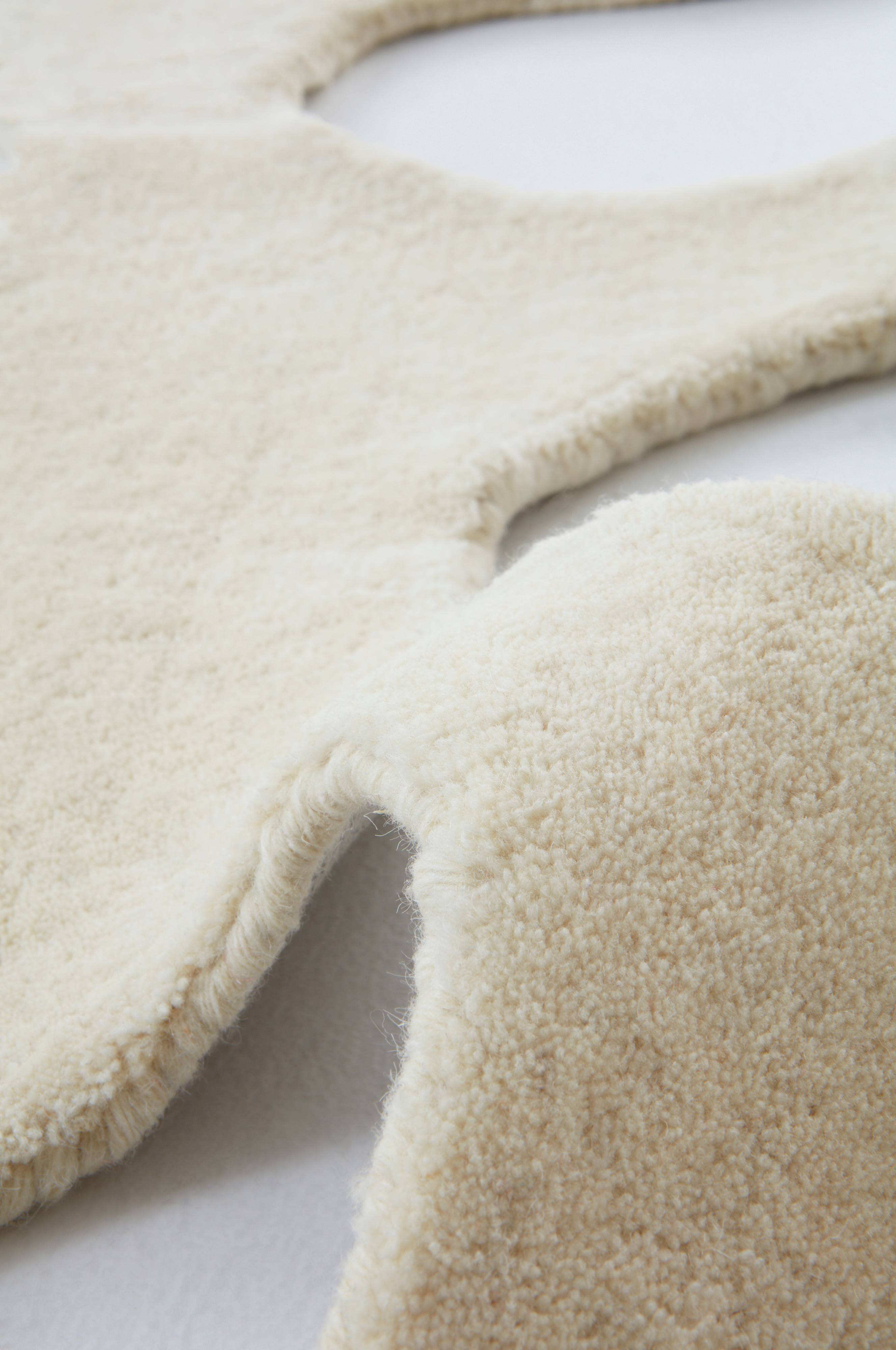 Håndtuftet, kraftig ullteppe med kort tett lugg. Teppet har svært spesiell, uregelmessig form og like uregelmessige, fint kantede hull som viser gulvet gjennom teppet. LOTUS gir rommet en herlig futuristisk følelse, og teppet vil garantert tiltrekke seg oppmerksomhet. Lugghøyde 1 cm. Tykkelse 1,5 cm. 2000 g/m².