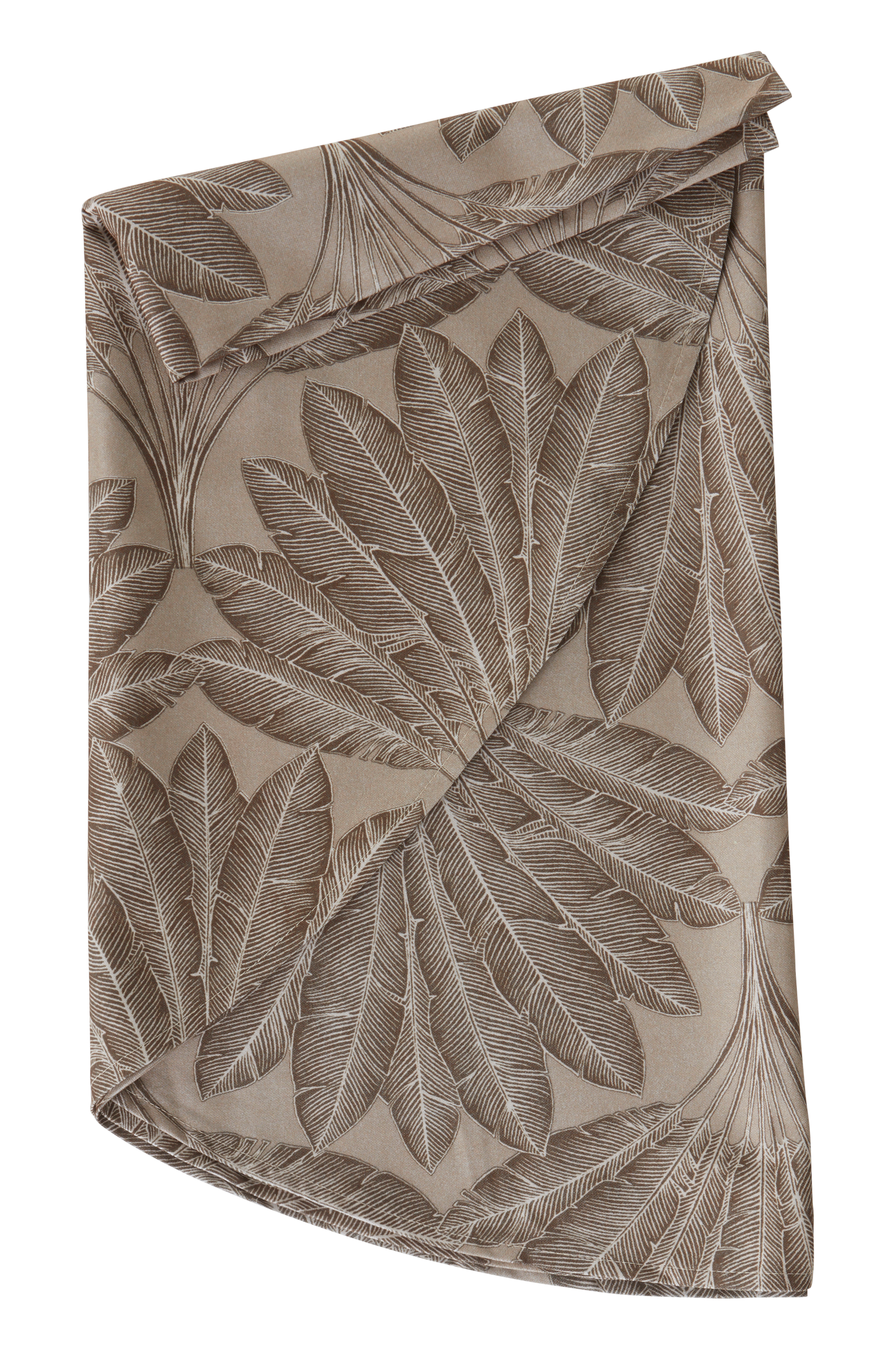Rund duk av polyester med suverent mønstertrykk skapt av fjær. Trykket går i en mørkere nyanse enn bunnfargen, og mønsteret oser både spenning og harmoni med et anstrøk av retro.