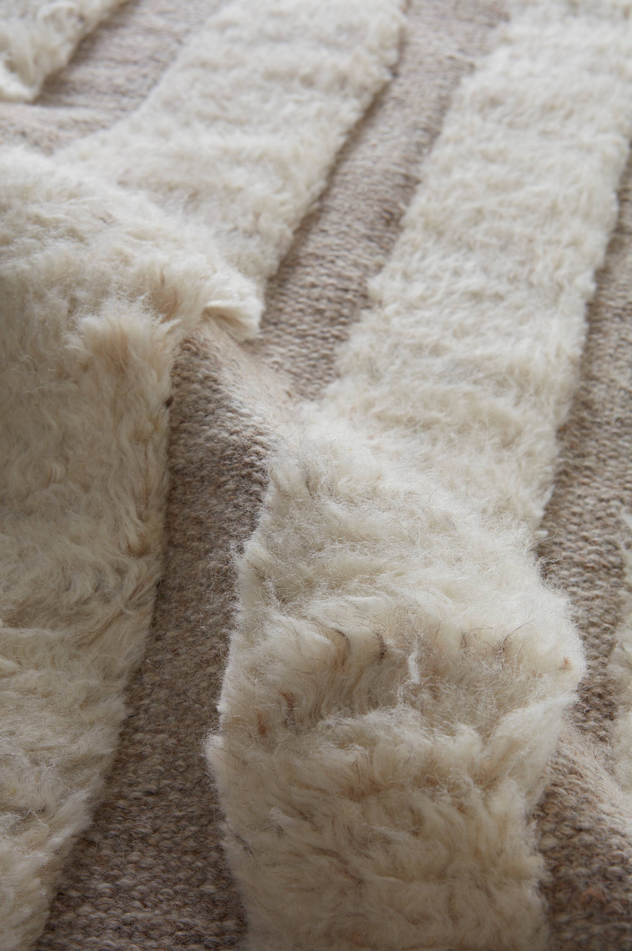 Håndknyttet ullteppe som har glattvevd bunn og den knyttede luggen lager det uregelmessig stripemønsteret. Teppet har fin flettet frynsekant langs kortsidene. Ull er et naturlig, varmt og deilig materiale. Et håndlaget teppe er et fint håndverk, og hvert teppe er unikt. Frynselengde 7 cm. Lugghøyde 2,6 cm. Tykkelse 2,9 cm. 2200 g/m².