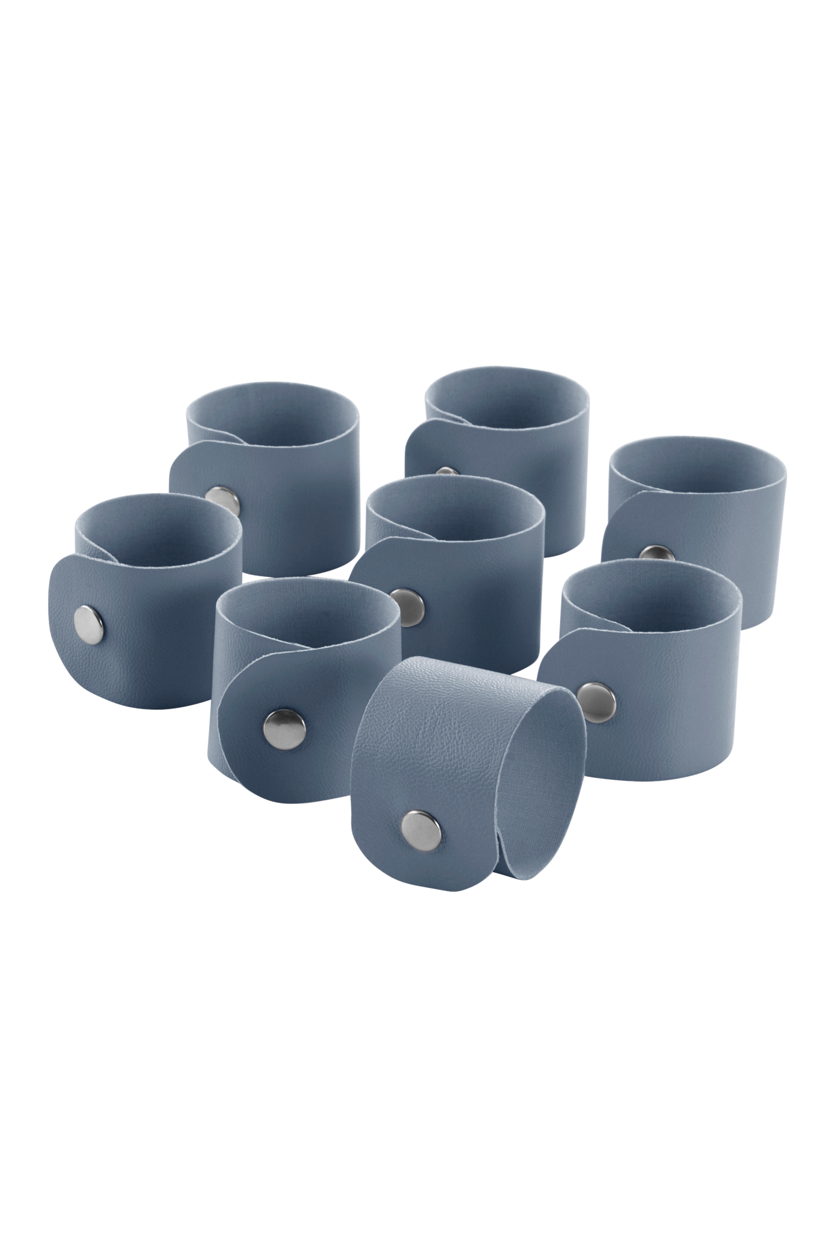8-pk serviettringer i kunstskinn av polyuretan. Serviettringen lukkes med en trykknapp, og gir en feststemt oppdekning.