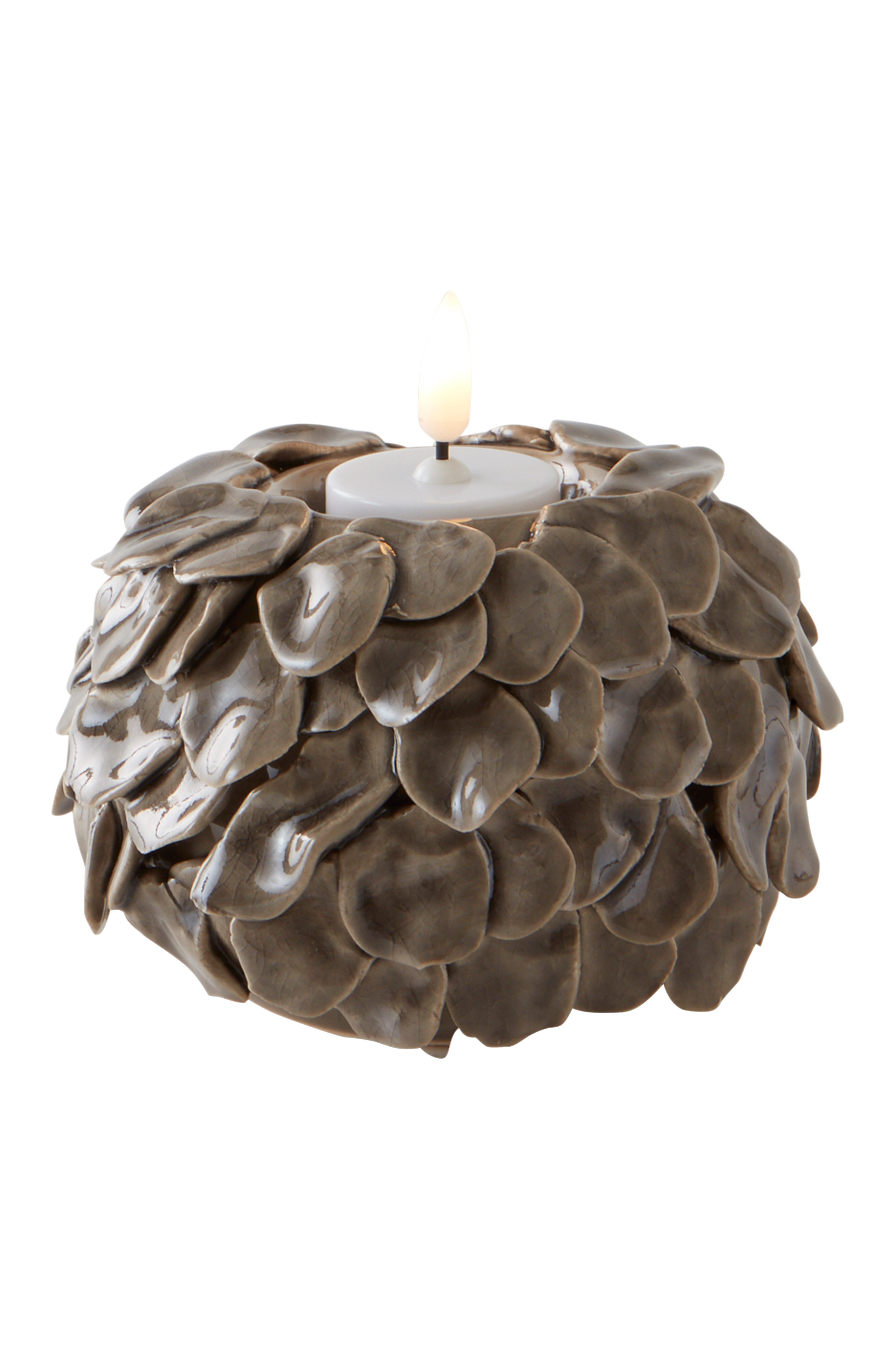 Håndlaget telysholder av keramikk med blank glasur med vakker, litt flammete effekt. Telysholderen har små uregelmessige blomsterblad som alle er satt på for hånd, et håndverk med presisjon som også gjør at hver telysholder er unik. Lys medfølger ikke.