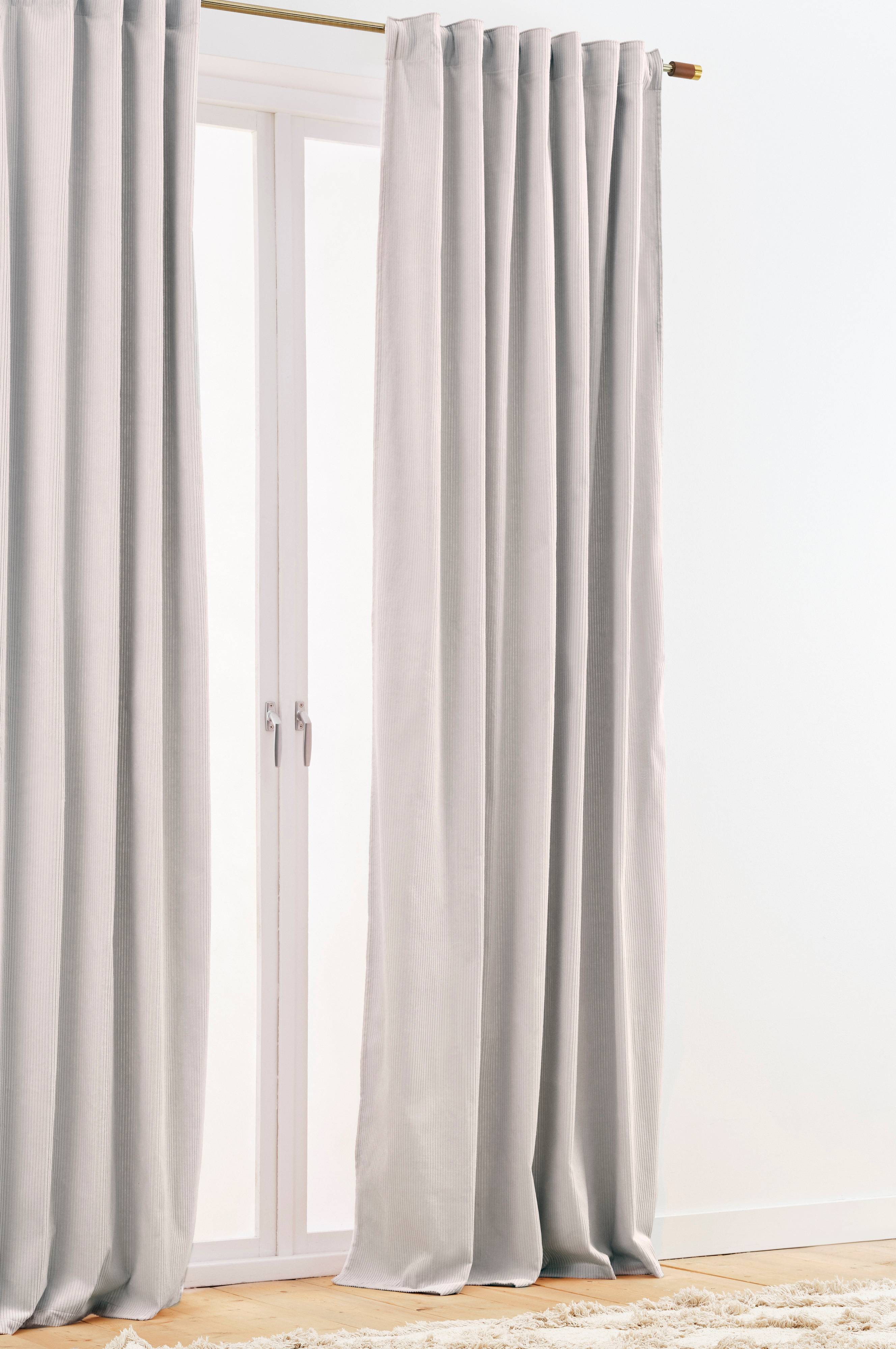 To gardinlengder i kordfløyel av bomull, et herlig stoff som er trendy og samtidig kan vekke herlig nostalgi. Kordfløyelen er bredsporet, og lengdene får tyngde og faller fint. Lengdene har påsydd multifunksjonsbånd, og kan henges opp med fingerkroker, kanal samt skjult hempe.