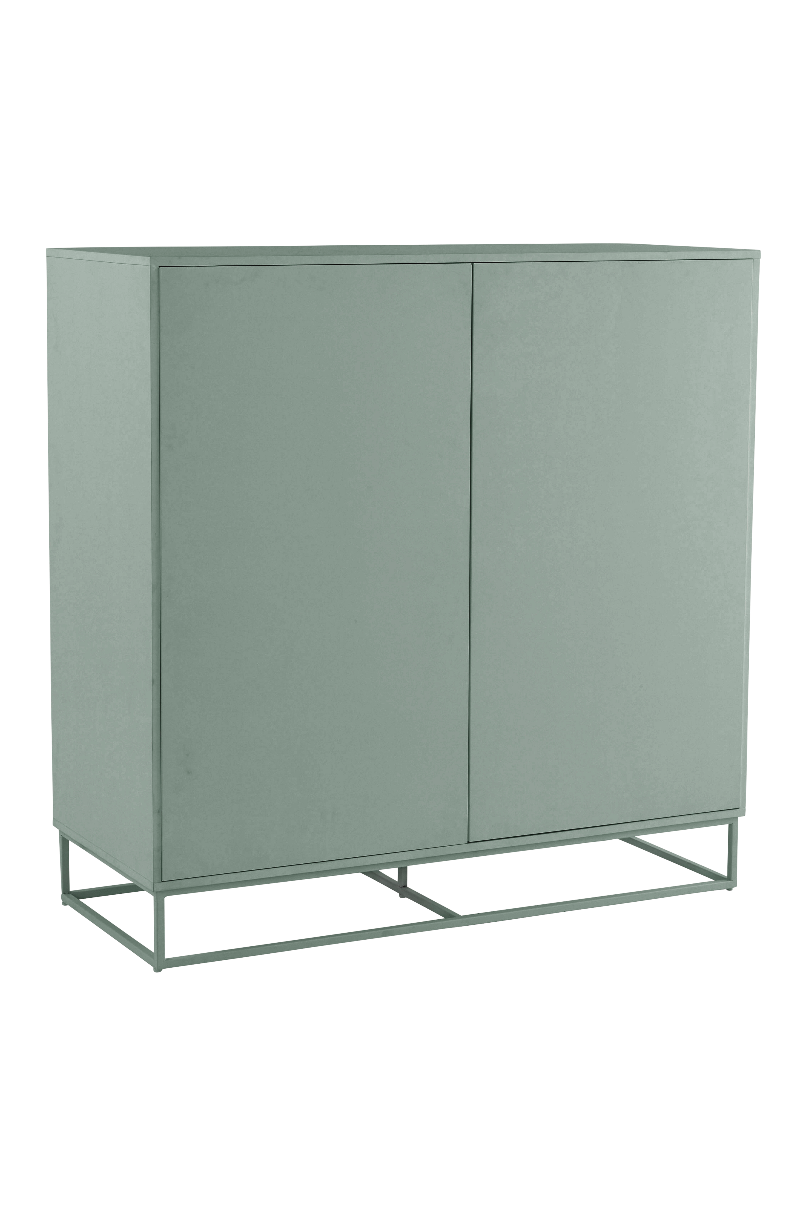 Skap av MDF med understell av metall. Det nedtonede og stilrene skapet har to dører med pushfunksjon. Det gjør at skapet er helt glatt uten håndtak og likevel lett å åpne. I skapet er det to hyller. Skapet er todelt, og det er to flyttbare hyller i hver del. Delene av MDF har vannbasert lakk. Understellet er av firkantprofil med pulverlakkering. Veggfestet gjør at skapet kan festes i veggen ved behov. Noe montering kreves. Monteringsanvisning medfølger.