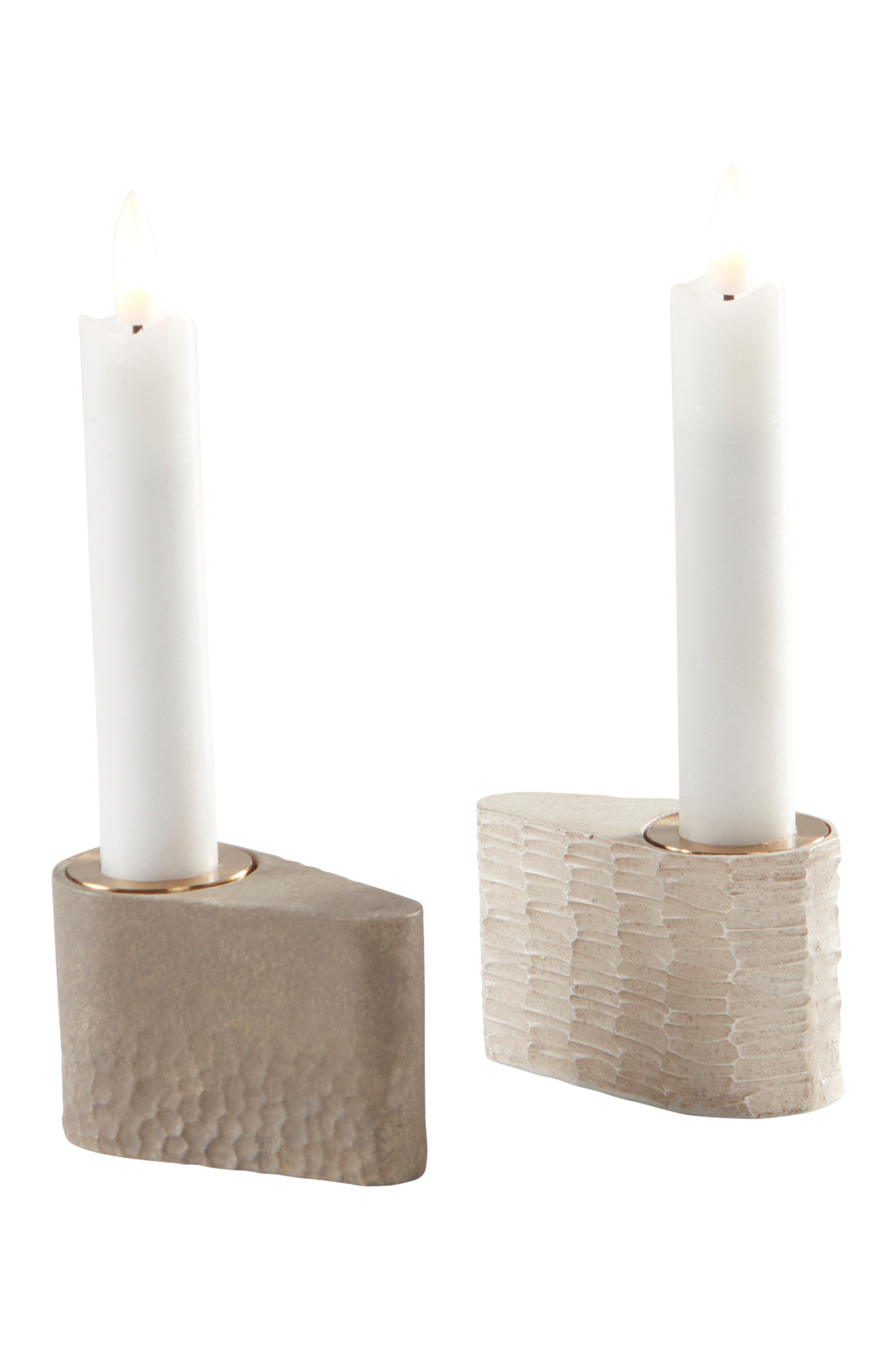 Stilren lysestake i 2-pk av polyresin som er fine å plassere separat eller sammen. Lysestakene har en matt finish og en dekorativ, gullfarget metallring øverst. Lys medfølger ikke.
