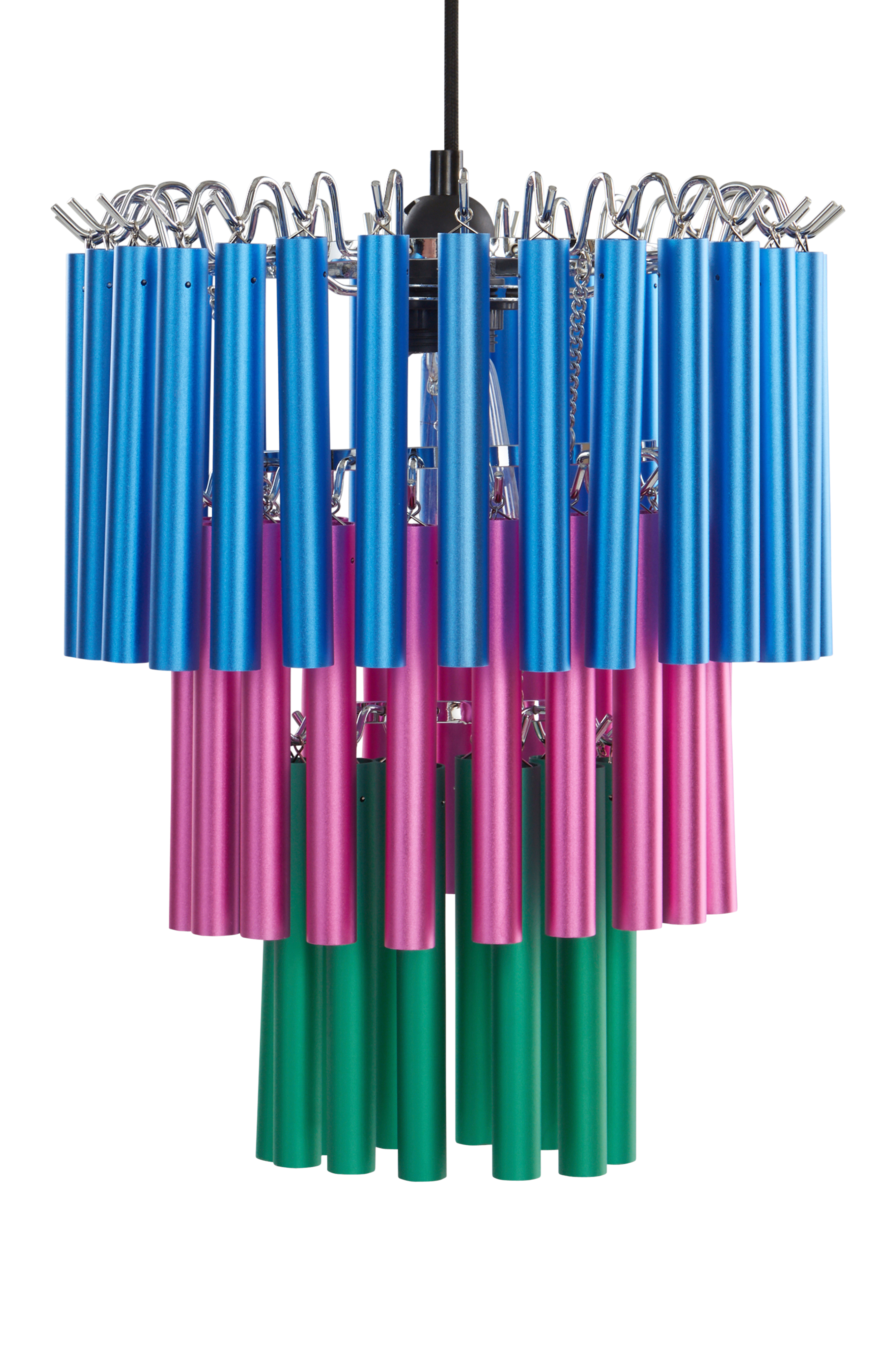 Taklampe som består av metallrør i lekre farger i tre etasjer. Lampen har svart tekstilkledd ledning og takkoppen er av plast, også den er svart. De klare fargene gir lampen herlig 80-tallsfølelse. Lampen er ujordet, klasse 2. På grunn av EU-regler kreves en separat takkontakt i visse land. Takkontakten skal være ujordet (klasse 2), og kjøpes separat.