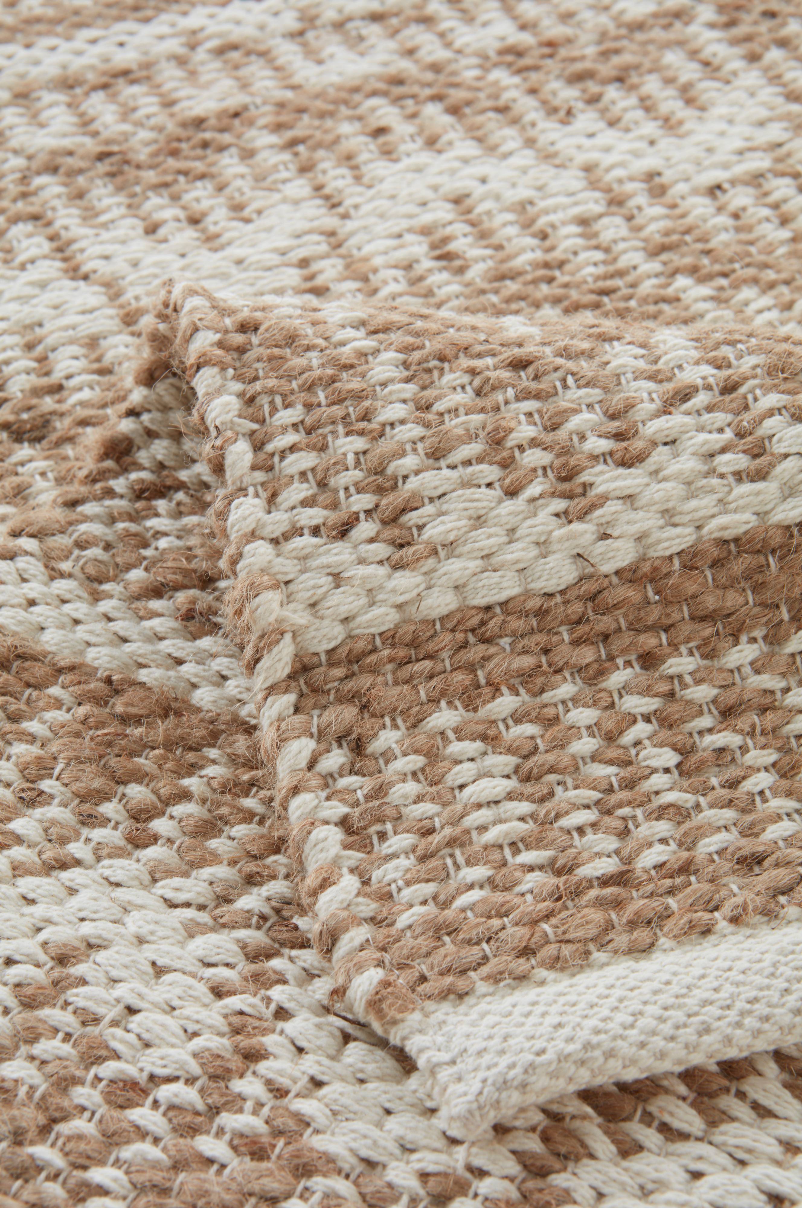 Håndvevd teppe av en herlig blanding av jute og bomull. Teppet har et fint vevd stripemønster og fast kant langs kortsidene. Jute er et rustikt naturmateriale. Et håndlaget teppe er et fint håndverk, og hvert teppe er unikt. Tykkelse 0,5 cm. 1900 g/m².