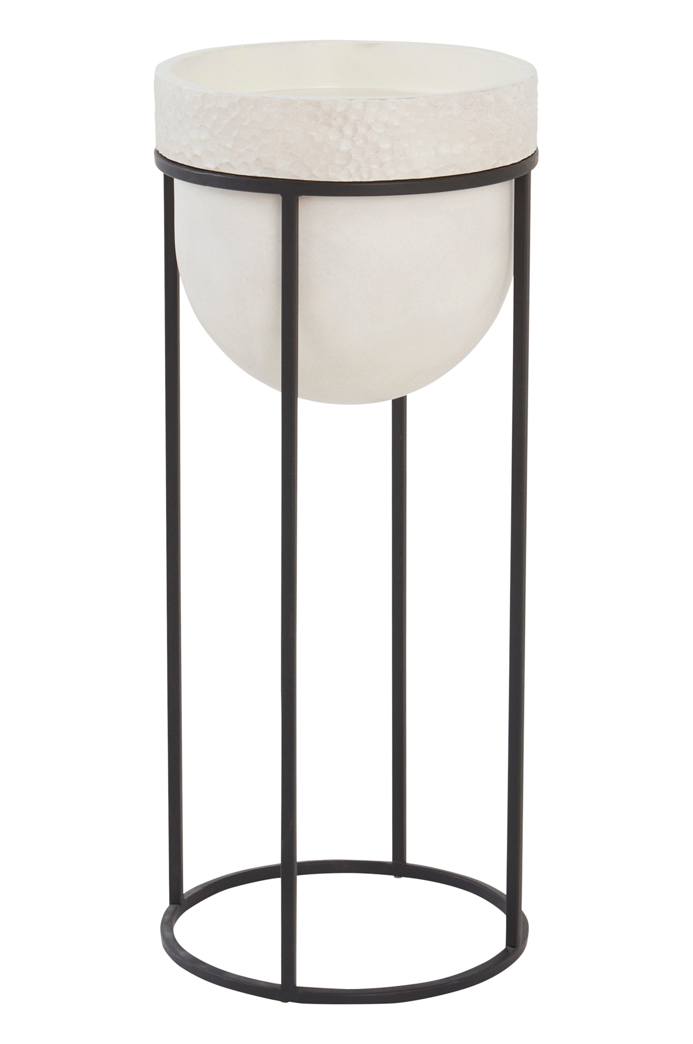 Vakkert formet potte av polyresin med metallstativ. Potten har en fin dekor og blank glasur.