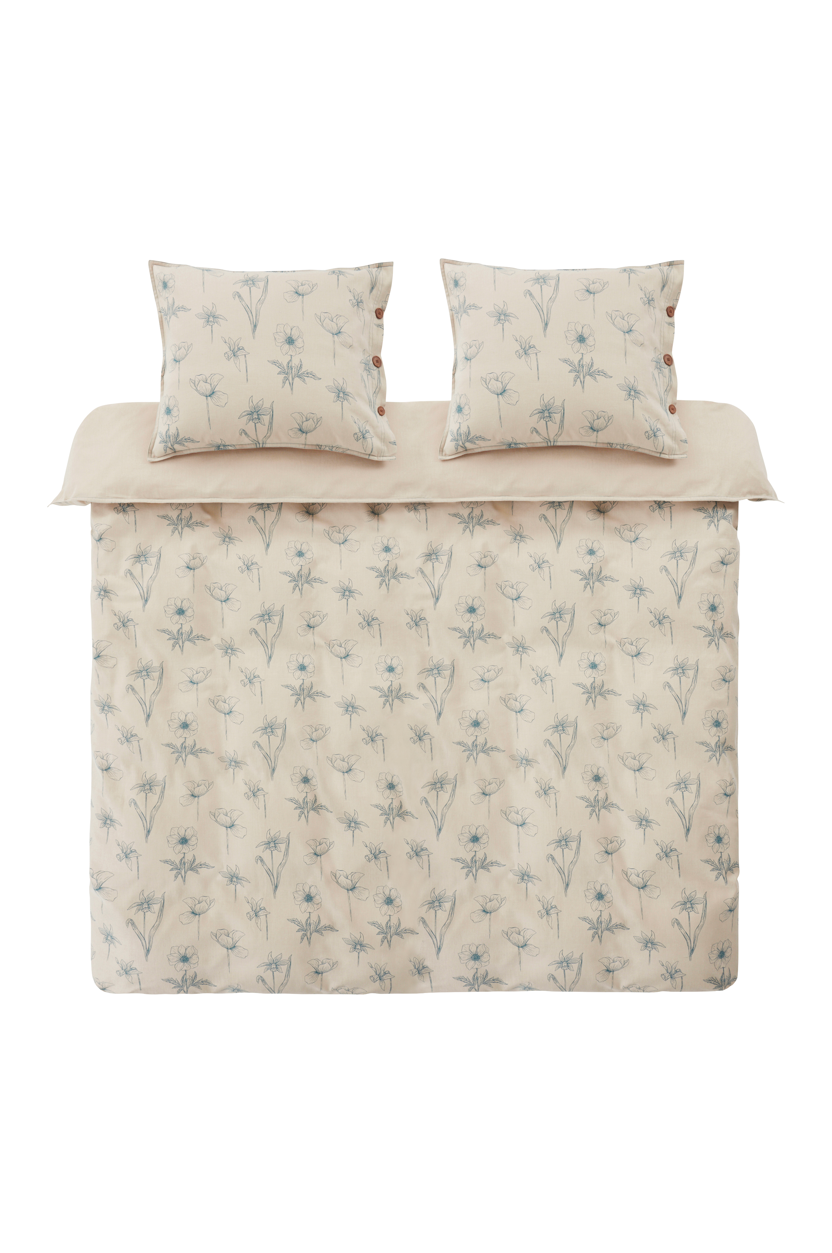Sengesett i 3 deler i fin kvalitet av bomull og lin. Den deilige kvaliteten forener bomullens mykhet med linets naturlige varme. Stoffet er vasket for å bli ekstra komfortabelt. MEADOW er vendbart og har lett blomstertrykk med herlig vårfølelse på den ene siden, den andre siden er ensfarget. Dynetrekk og putevar har dobbeltsøm rundt, og sømmene er dekorative i seg selv da de matcher fargen på trykket. Plastknapper som ligner tre for lukking. Trådtetthet på 80 tc. (Trådtettheten forteller om antallet tråder, thread counts, pr. kvadrattomme i et stoff. Jo høyere trådtetthet, desto høyere kvalitet. Unntaket er lin som ofte veves løsere for å få den riktige følelsen.)