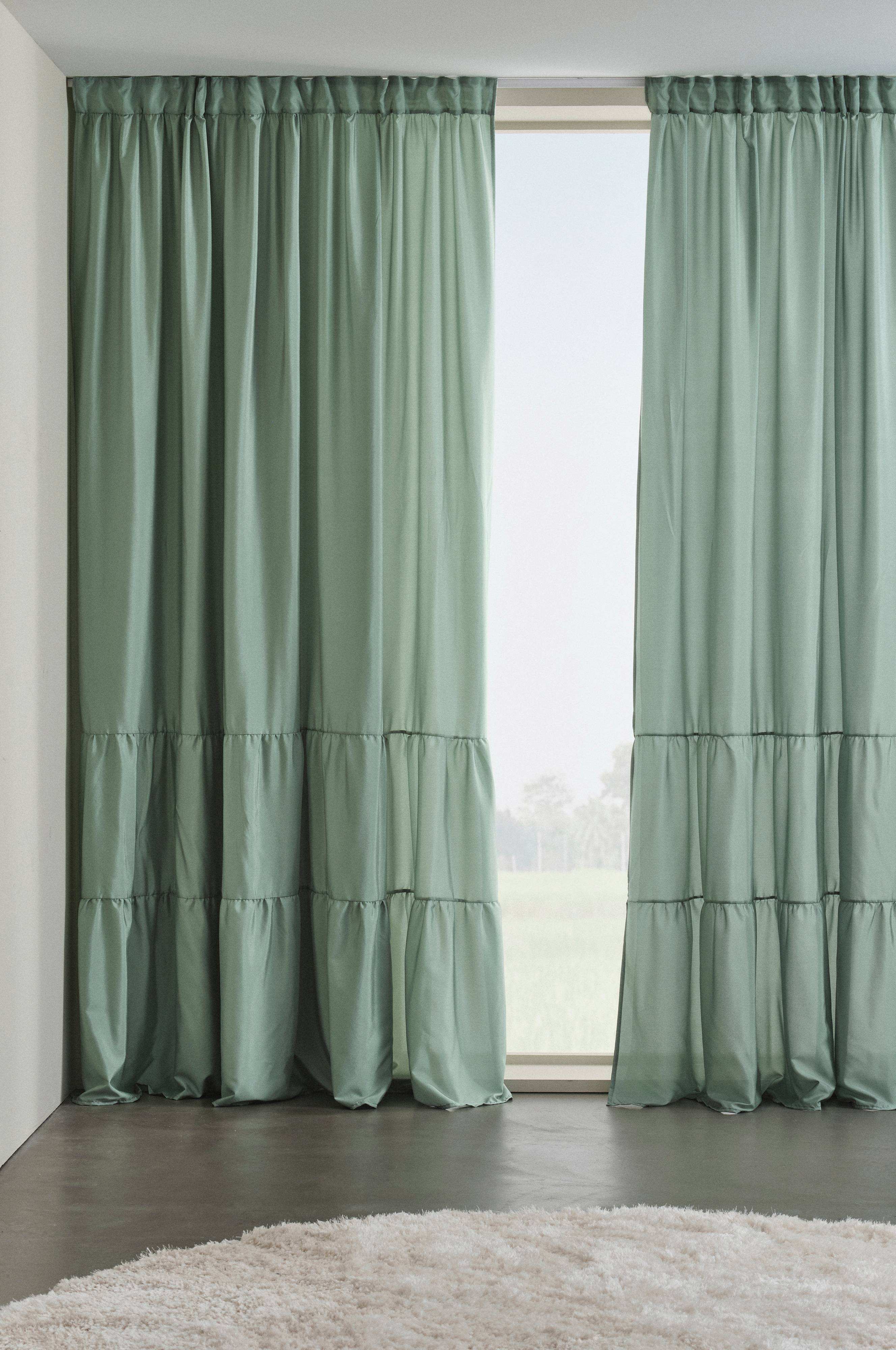 To gardinlengder i ensfarget polyesterstoff i vakre farger som skinner og glitrer litt. Lengdene har brede volanger nederst, en fin detalj som gjør gardinlengene spesielle.
