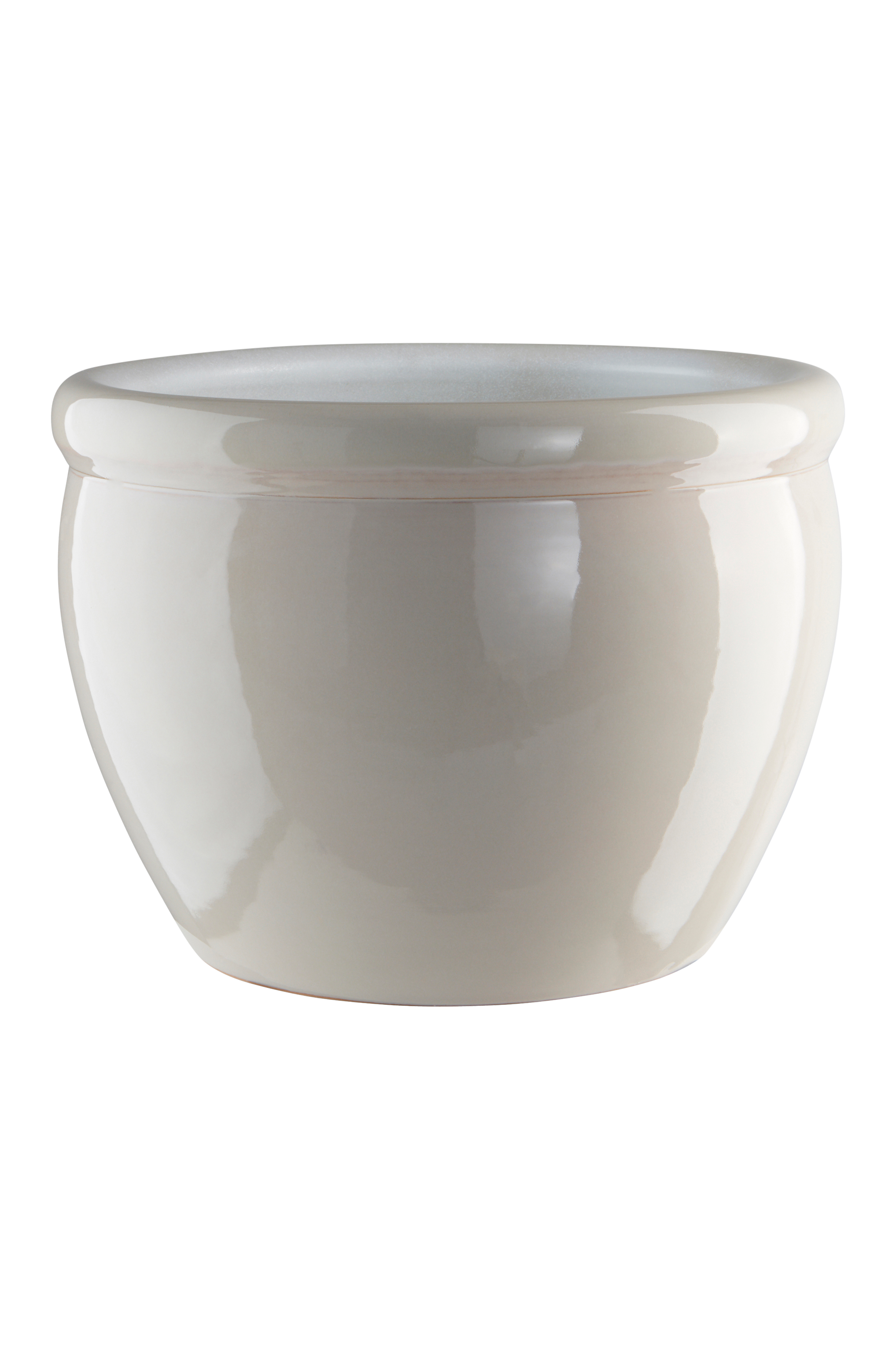 Håndlaget potte av keramikk. Potten har mykt avrundet form og høyblank glasur. Innsiden er også glasert. Det fine håndverket gjør hver potte unik. Husk at keramikk kan slippe gjennom fukt.