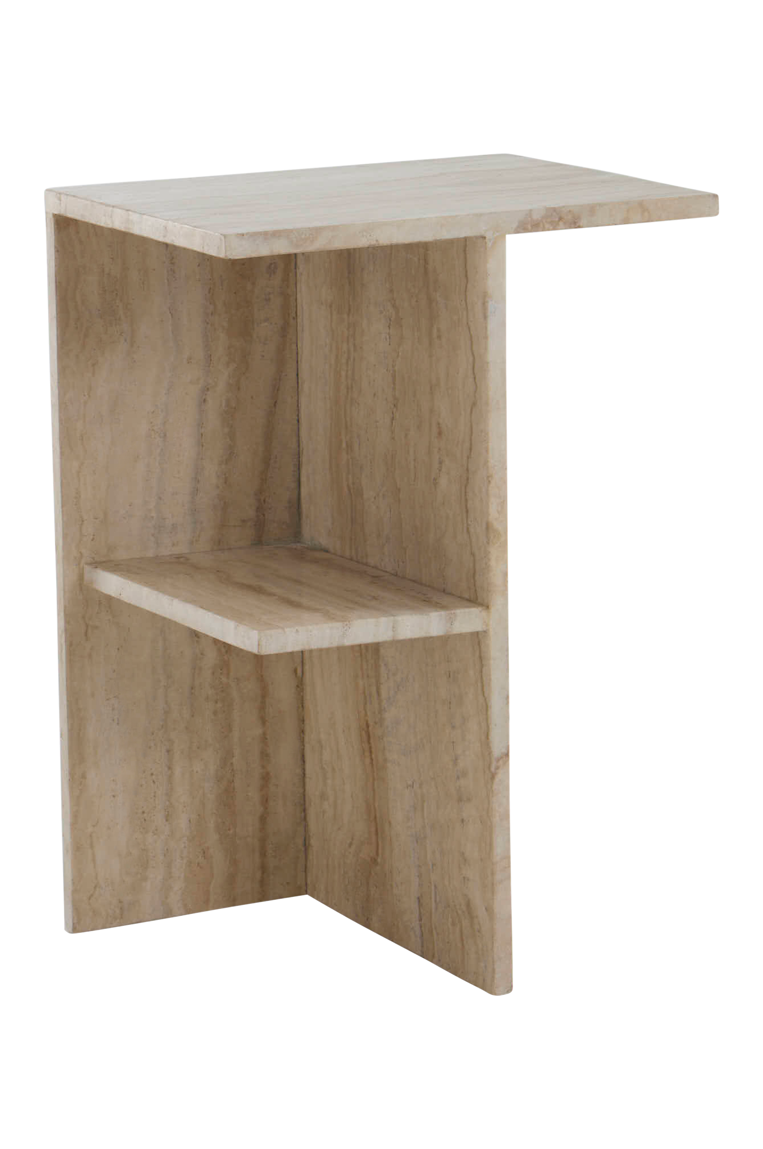 MELETO nattbord er laget av travertin med unike marmoreringer og mønstre. Bordet har en hylle på venstre side for oppbevaring, passer best på høyre side av sengen og kan også brukes som skjenk i stuen. Inkluderer tippsikre beslag for sikkerhet.