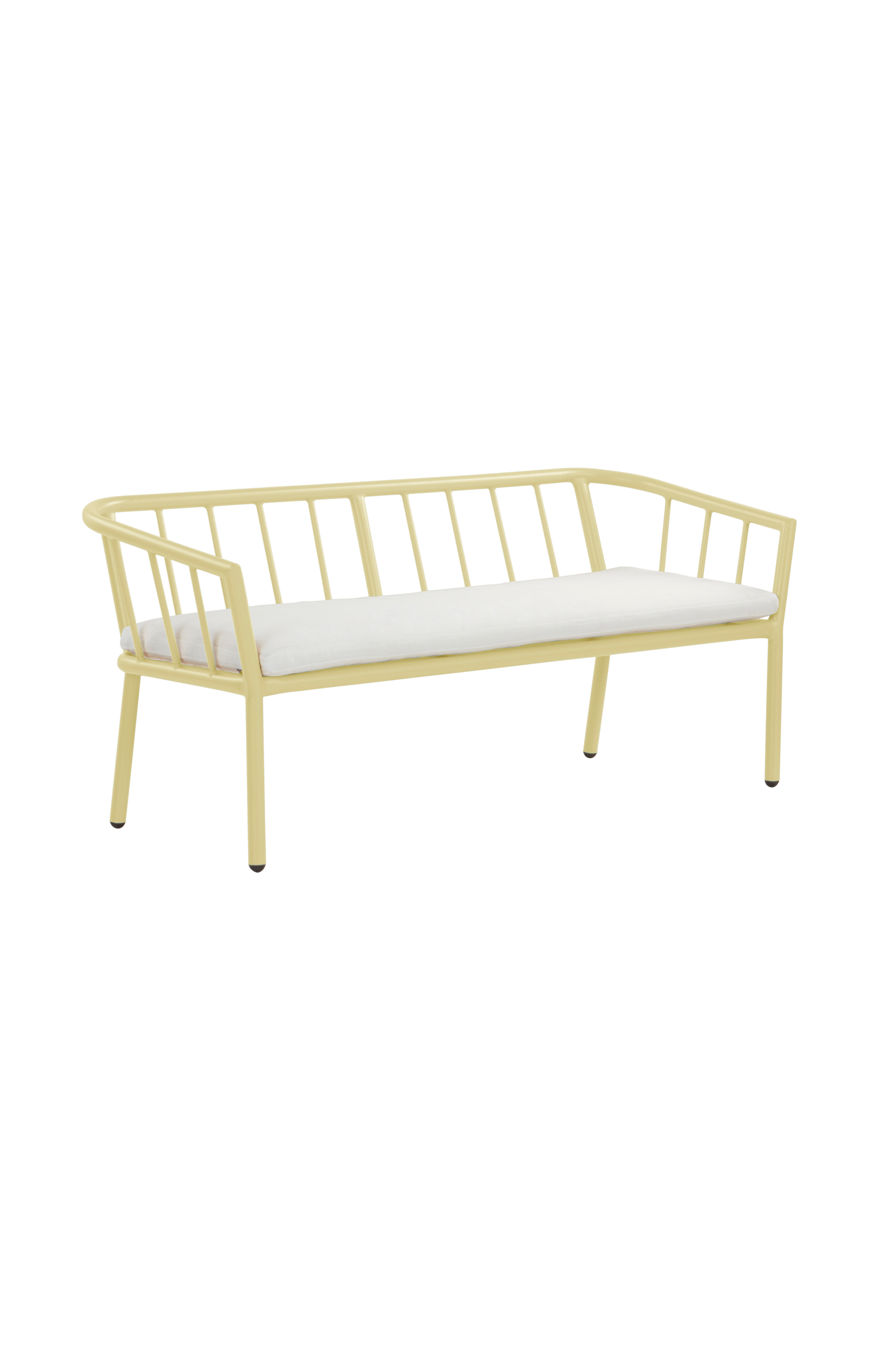 Barnesofa av pulverlakkert aluminium med matt overflate som ikke blender i solskinnet. Sittepute med trekk av polyester og skumgummifyll. MENTON tåler å stå utendørs, noe som gjør utelivet enklere. Du slipper å bære når du vil sitte ute. Møbelet er nett, og de minste sitter komfortabelt i sin egen sofa. Lav vekt.