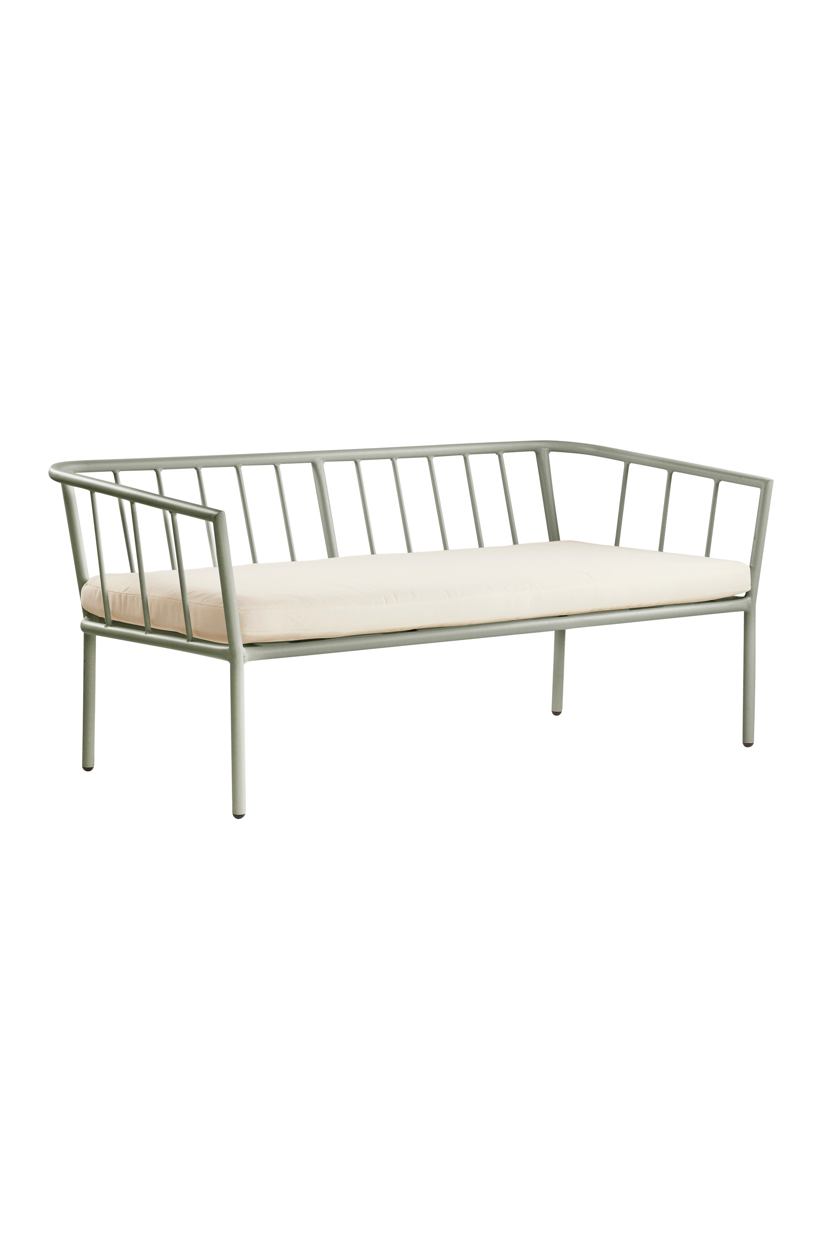 Sofa i pulverlakkert aluminium med matt overflate. Sittepute med polyestertrekk og skum. Den er flott å flytte ut på balkongen eller i hagen når sommeren er her. MENTON kan stå ute, og det gjør utelivet enklere. Du slipper å bære så snart du vil sitte ute. Sofaen er pen og har en behagelig setedybde, og den lave setehøyden gir en fin loungefølelse. Sitteputen følger med, og sofaen blir ekstra fin hvis du kompletterer den med fine puter langs ryggstøtten. Ensfargede farger og mønstre gir mulighet for morsom variasjon. Lav vekt. MENTON er enkel å stable for oppbevaring.