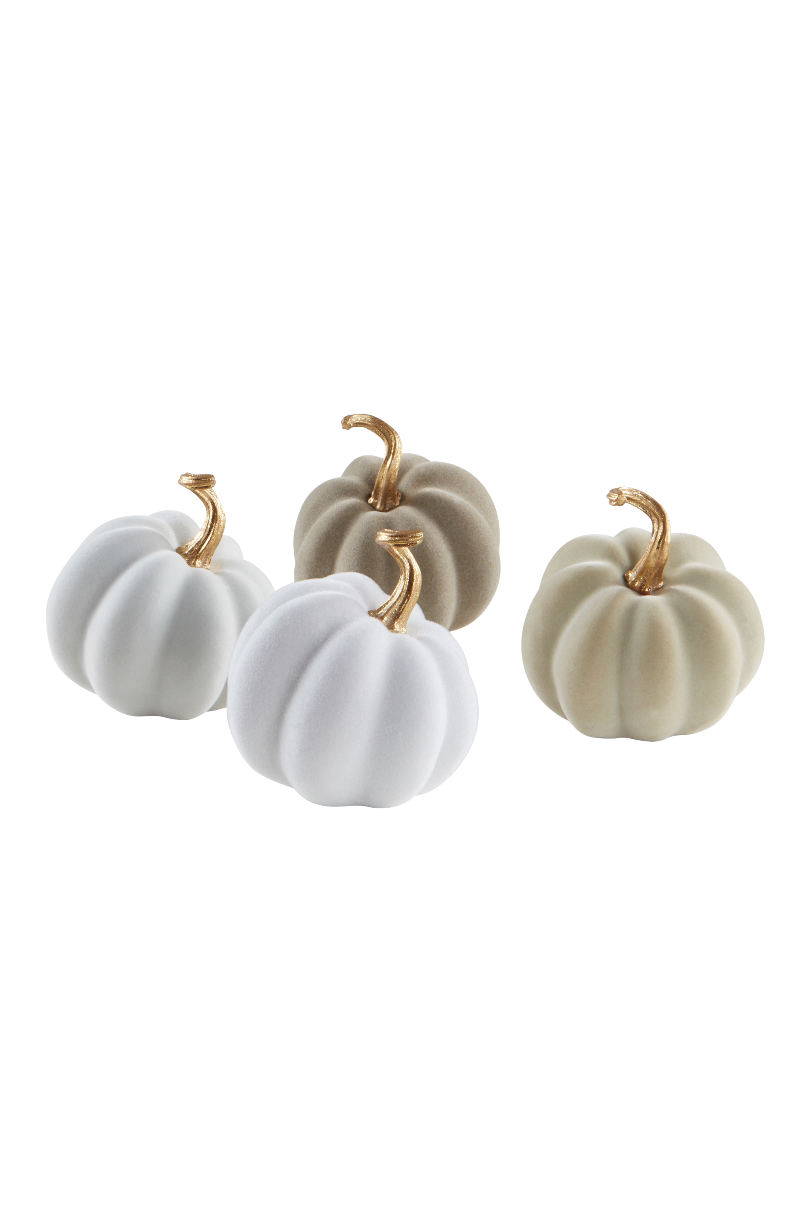4-pk dekorgresskar av skimrende fløyel. Kvisten øverst er støpt i polyresin. Gresskarene har en hard kjerne av polyresin. Enkelte deler av produksjonen er utført for hånd, og hvert gresskar er unikt.