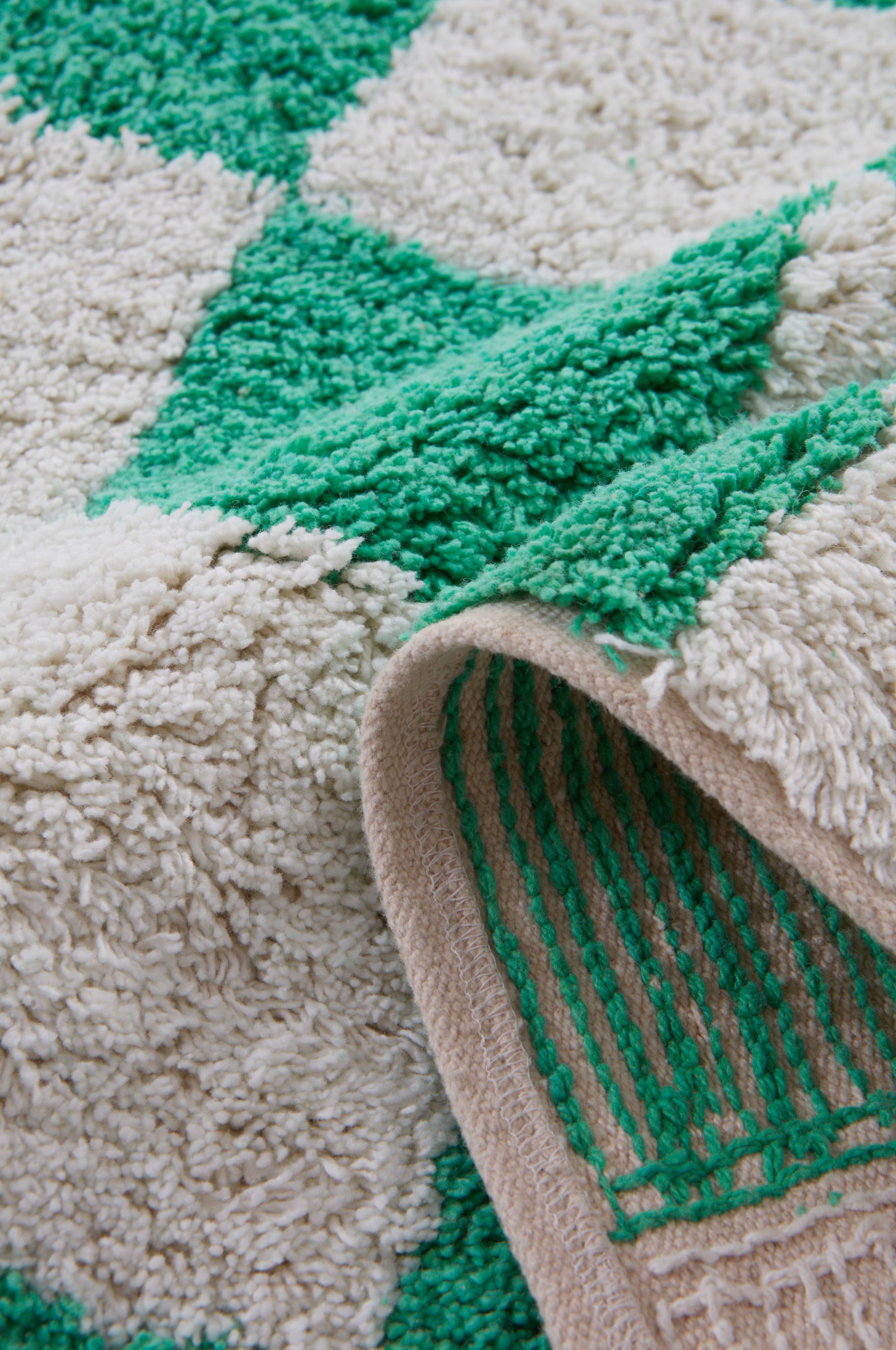 Bomullsteppe av økologisk bomull. Det herlige teppet har myk lugg med garnfargede ruter og vevd, naturfarget kant rundt. Lugghøyde 1-1,5 cm. Tykkelse 2 cm. 1300 g/m².