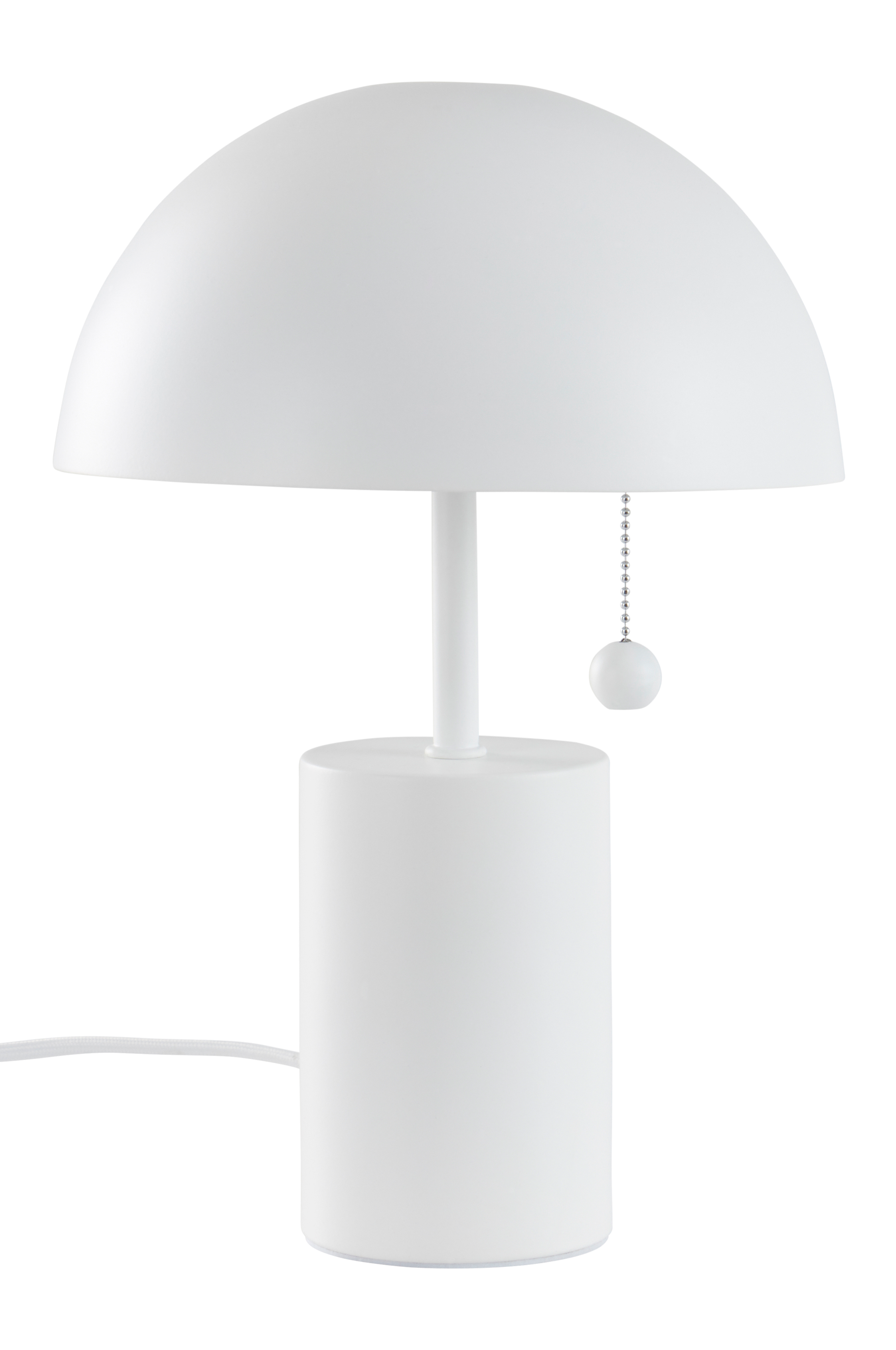 Lekker bordlampe av metall med avrundet kuppel, en homogen lampe som gir fint lys. Lampen har strømbryter i snor under skjermen, en kule på kulekjede som du drar i for å tenne og slukke, praktisk og dekorativt. Ledningen matcher også i farge.