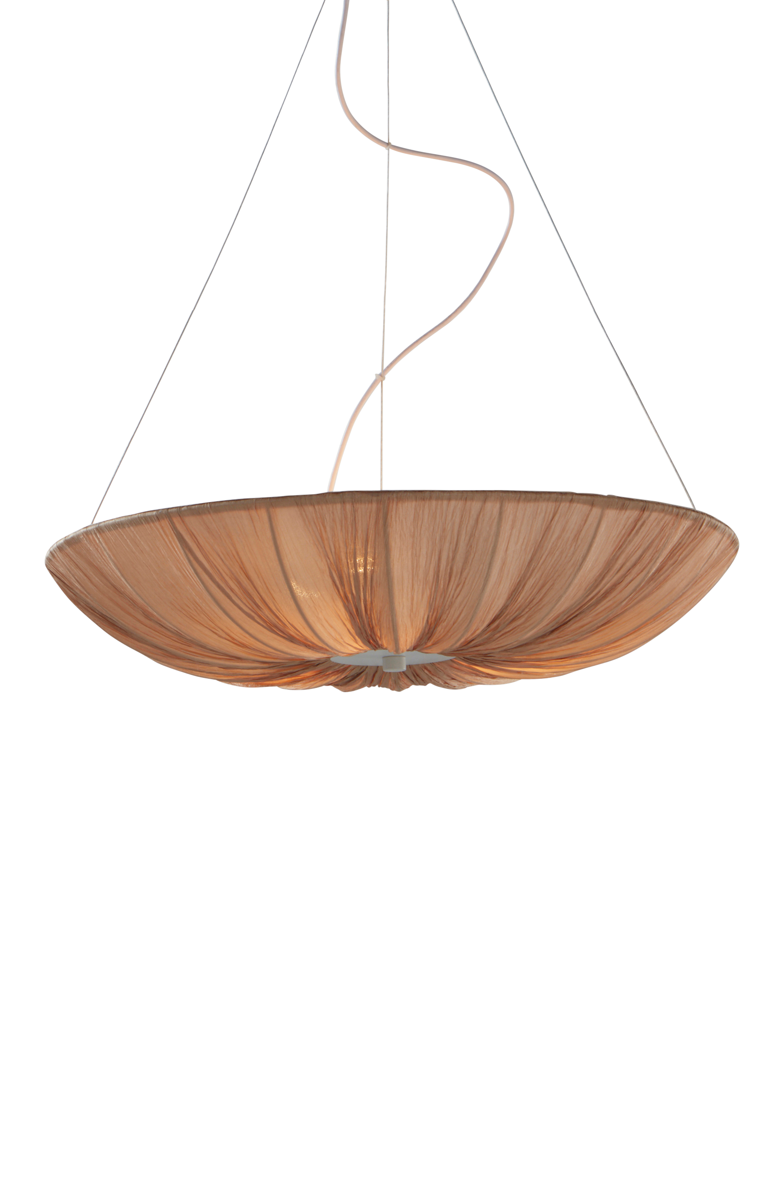 Taklampe med tekstilskjerm og stamme av metall. Lampen har litt skyfølelse, og er herlig retroinspirert. Det behagelige lysskinnet gjør lampen lett å plassere. Takkoppen er også av metall med krokoppheng. Lampen henges opp i tre vaiere med justerbar lengde slik du får lampen på riktig nivå. Lampen er jordet, klasse 1. På grunn av EU-regler kreves en separat takkontakt i visse land. Takkontakten skal være jordet (klasse 1), og kjøpes separat.