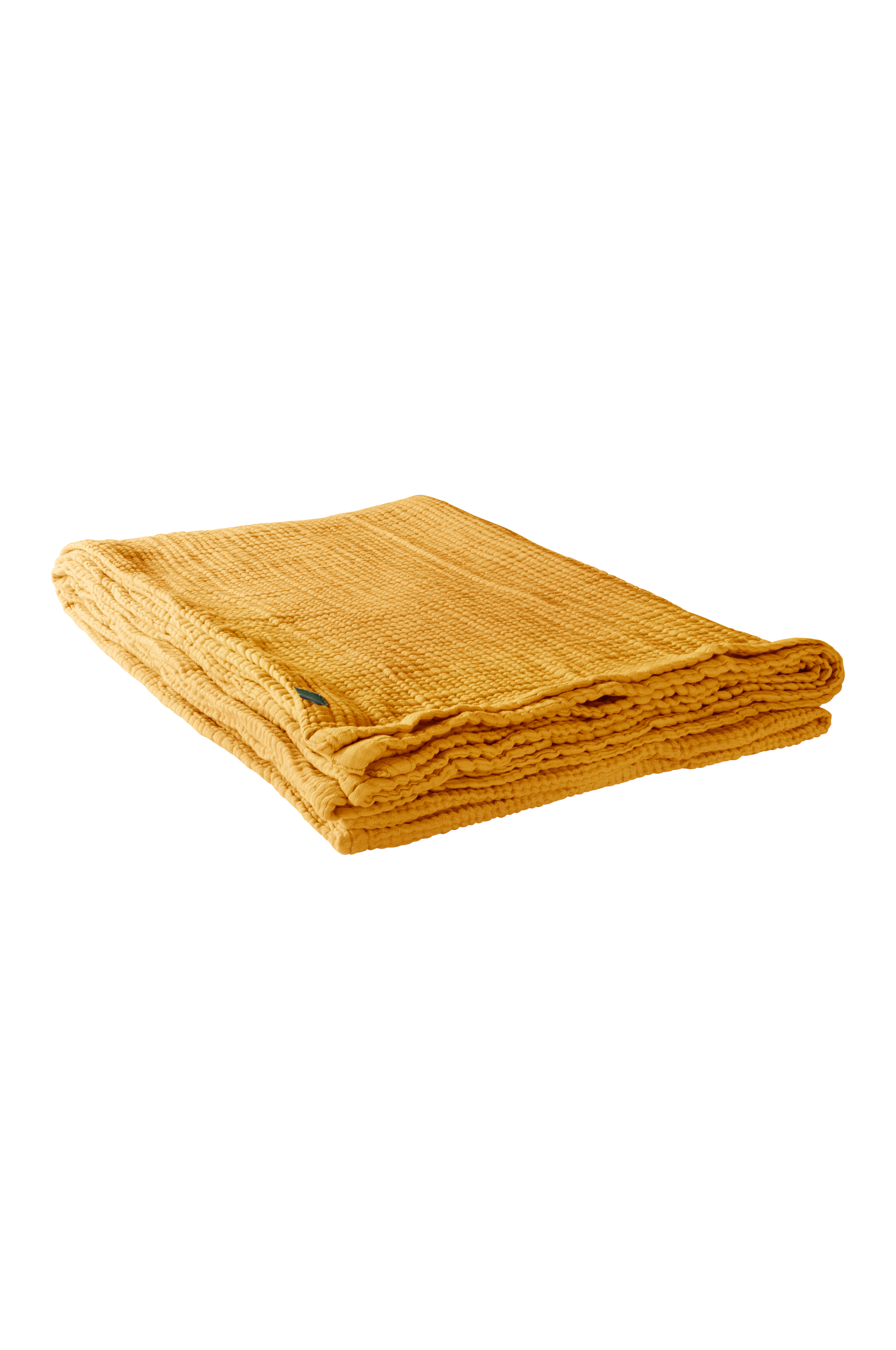 Sengeteppe til enkeltseng. Sengeteppe i herlig bomullsmusselin, Den herlige musselinkvaliteten er garnfarget, kraftig og steinvasket for å bli herlig myk og deilig. Søm rundt sengeteppet skaper en pen kant, 2 cm bred. Vekt 180 g/m².