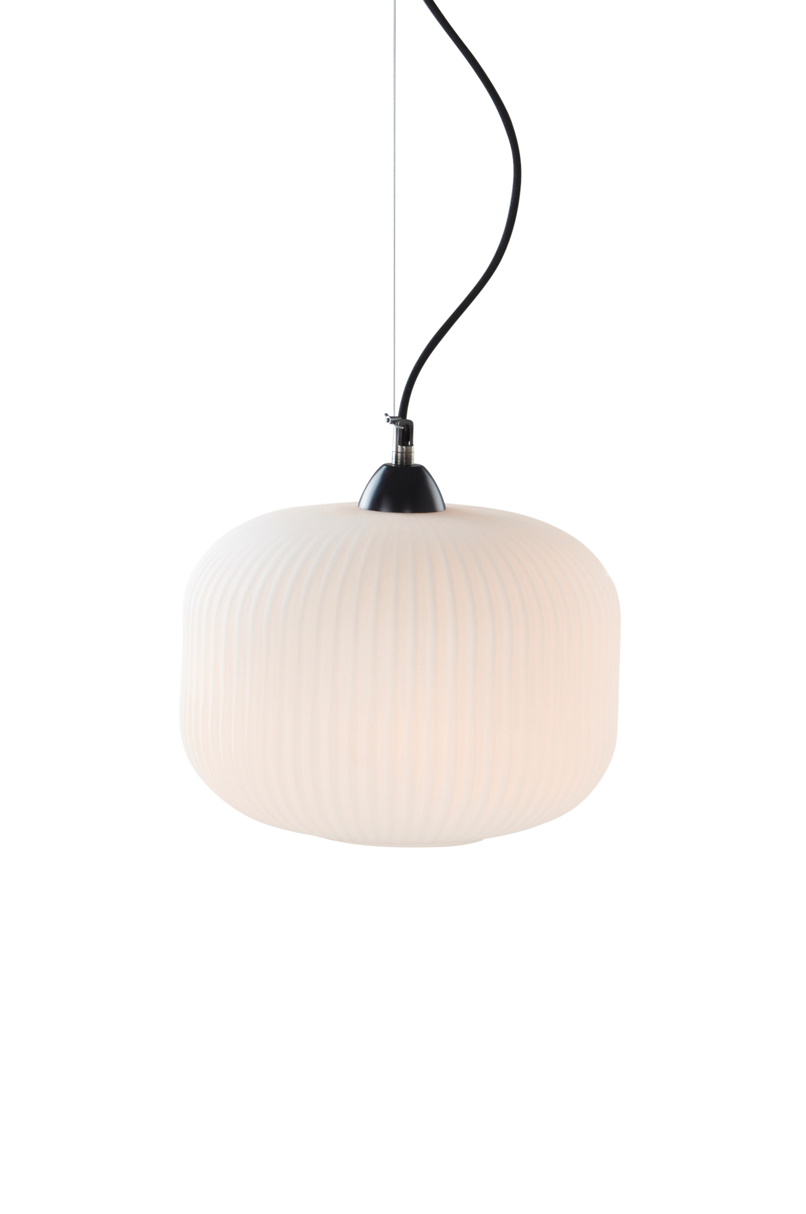 Taklampe i hvitt opalglass med bølgeformet overflate. Den hvite kuppelen sprer et vakkert og varmt lys. Lampefestet og takkoppen er svarte. Svarte detaljer sammen med svart tekstilledning forhøyer følelsen, og gir en mer luksuriøs framtoning. Ledningslengde 1,2 m.