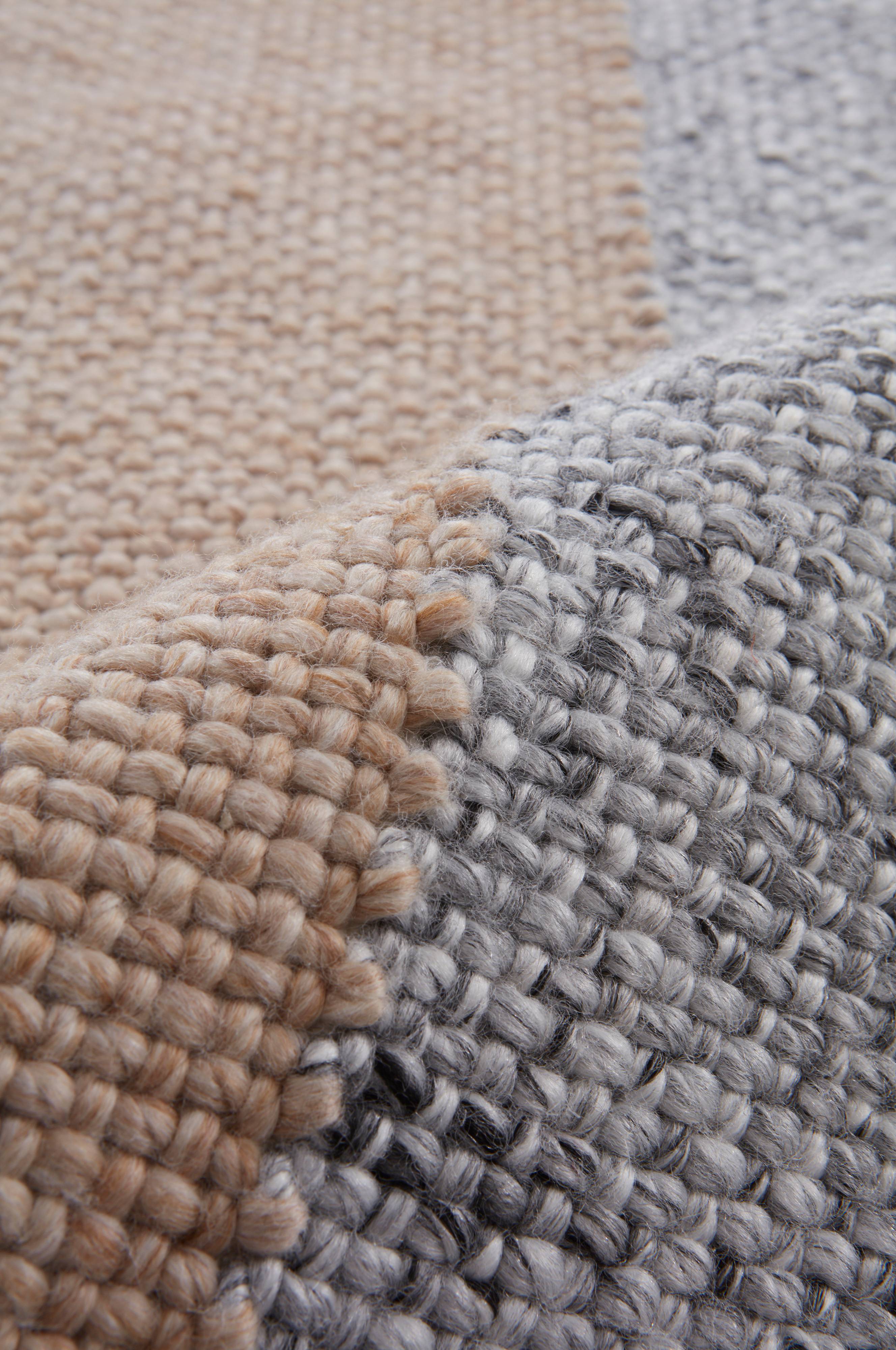 Glattvevd teppe som er håndvevd i garn av gjenvunnet polyester. Vevteknikken gir fin, litt grov tekstur, og garnet har melert effekt. De tvinnede frynsene følger teppets farger. Håndverket gjør hvert teppe unikt. Teppet er behagelig å gå på, og har alle egenskapene et innendørsteppe skal ha. Det kan også brukes utendørs. Det tåler å bli vått uten å mugne, en fantastisk fordel hos materialet. Frynselengde 5 cm. Tykkelse 0,7 cm. 2300 g/m².