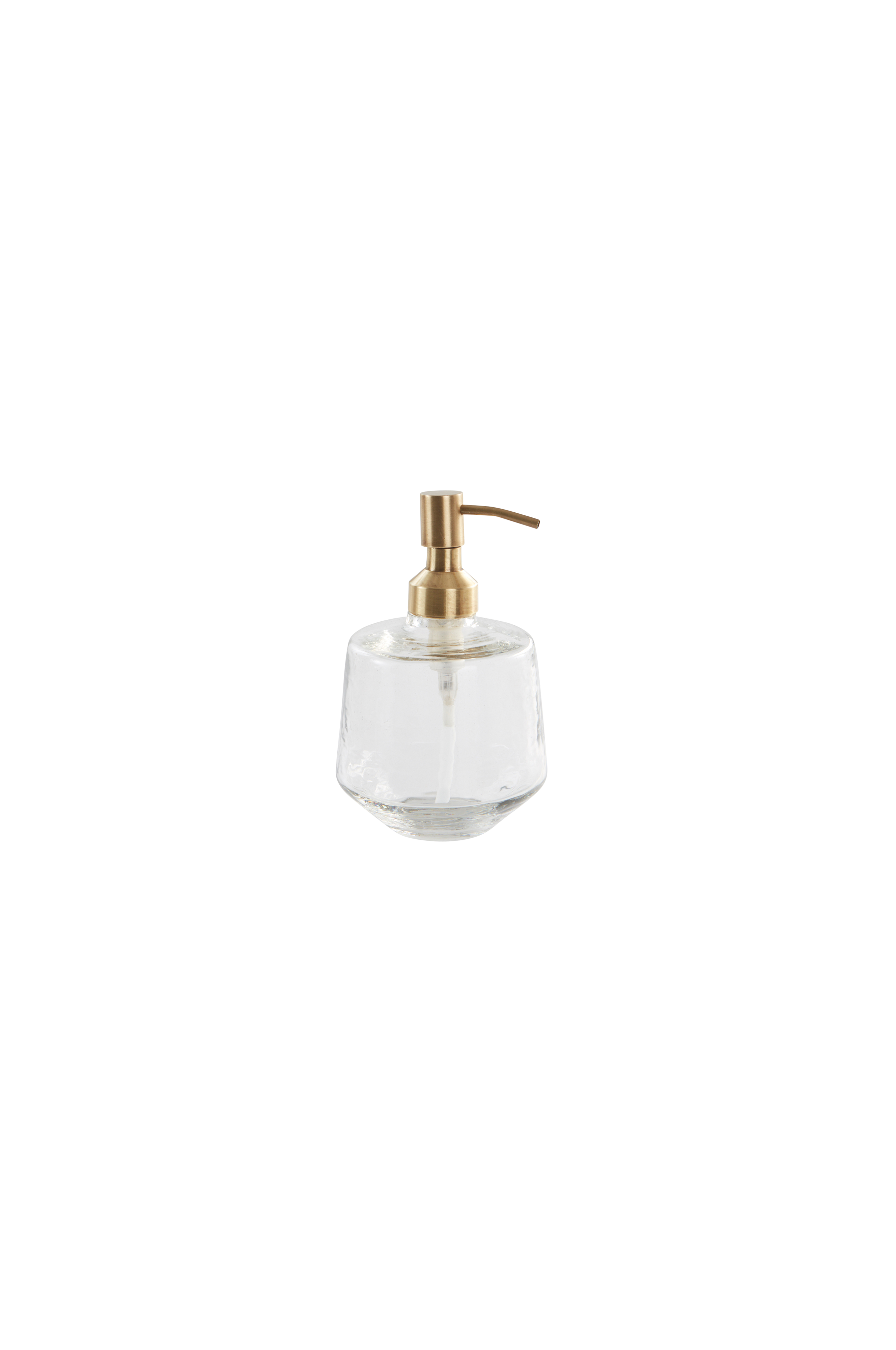 Såpepumpe av glass med pumpe av messing og plast. Beholderen er åttekantet, og glasset har en hamret tekstur som gir en gammeldags og håndblåst følelse. Pumpen skrues lett av for påfyll av flytende favorittsåpe.