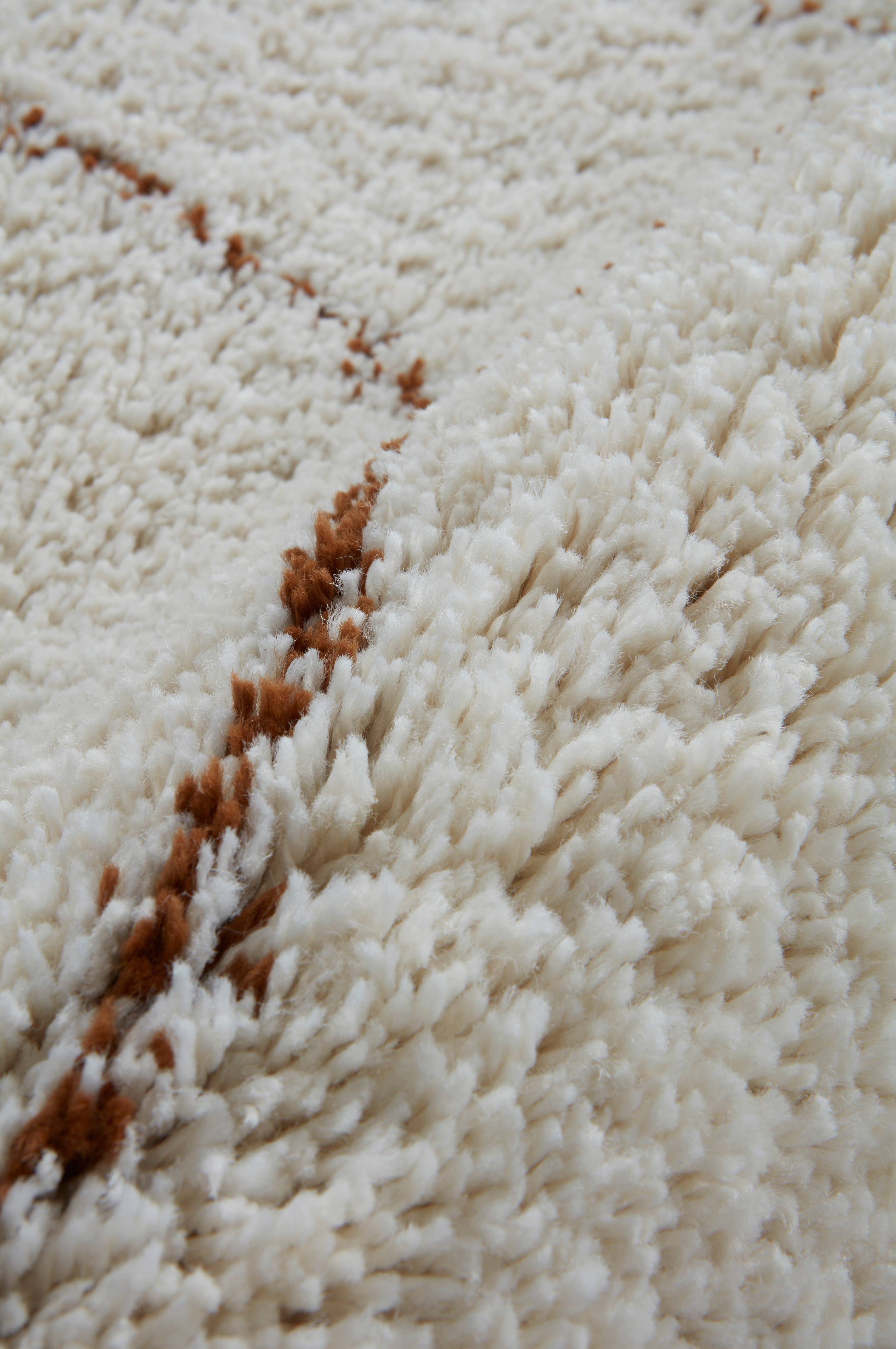 Luggteppe med lekkert mønster av brune buer på lys bunn. Teppet har tett, lang, deilig lugg i et mykt garn. Lugghøyde 3,5 cm. Tykkelse 3,8 cm. 2400 g/m².