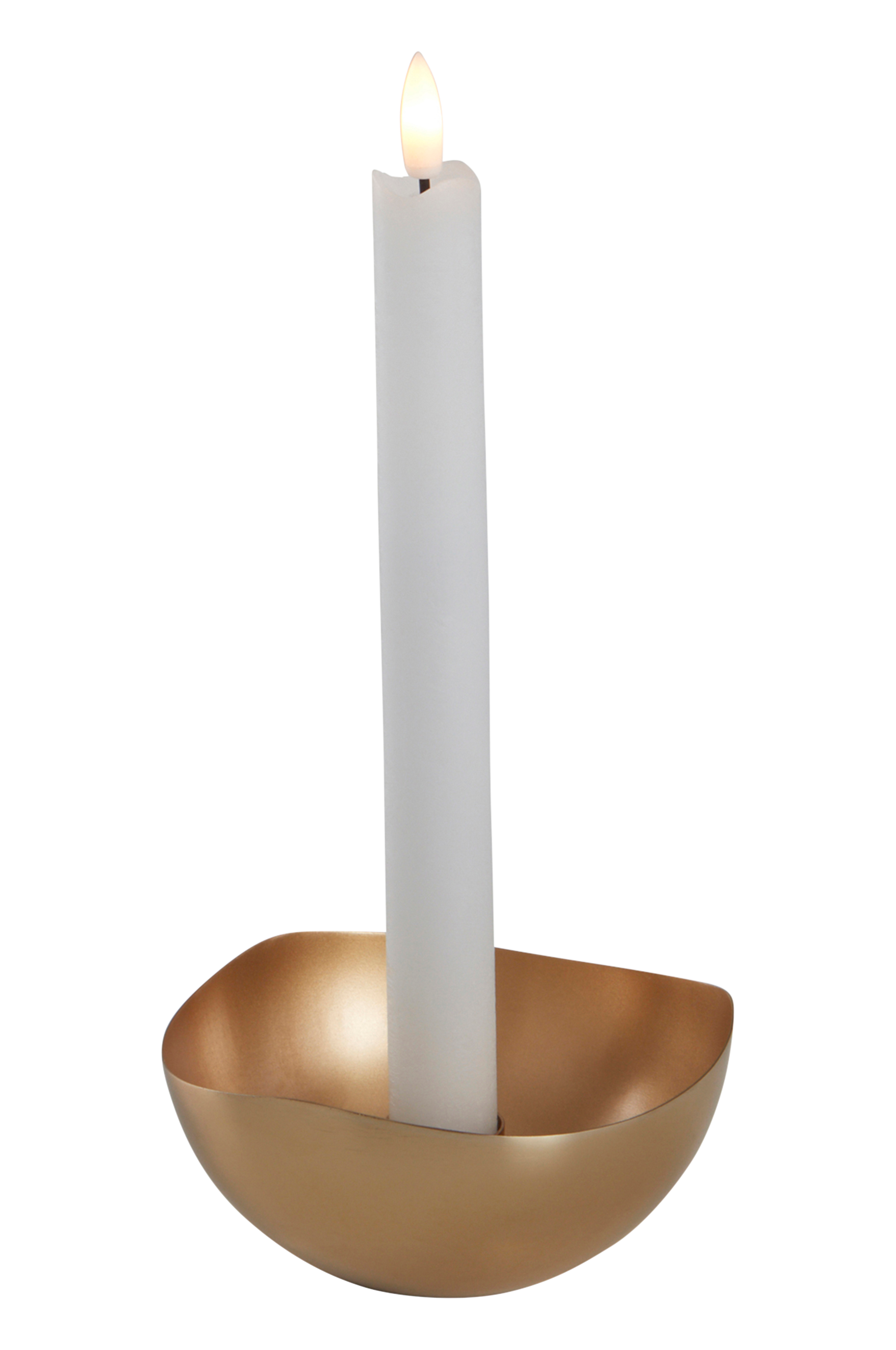 Lysestake av jern med gullfarget innside. En stilren lysestake med uregelmessig form som lyser opp et vakkert dekket bord. Lys er ikke inkludert.