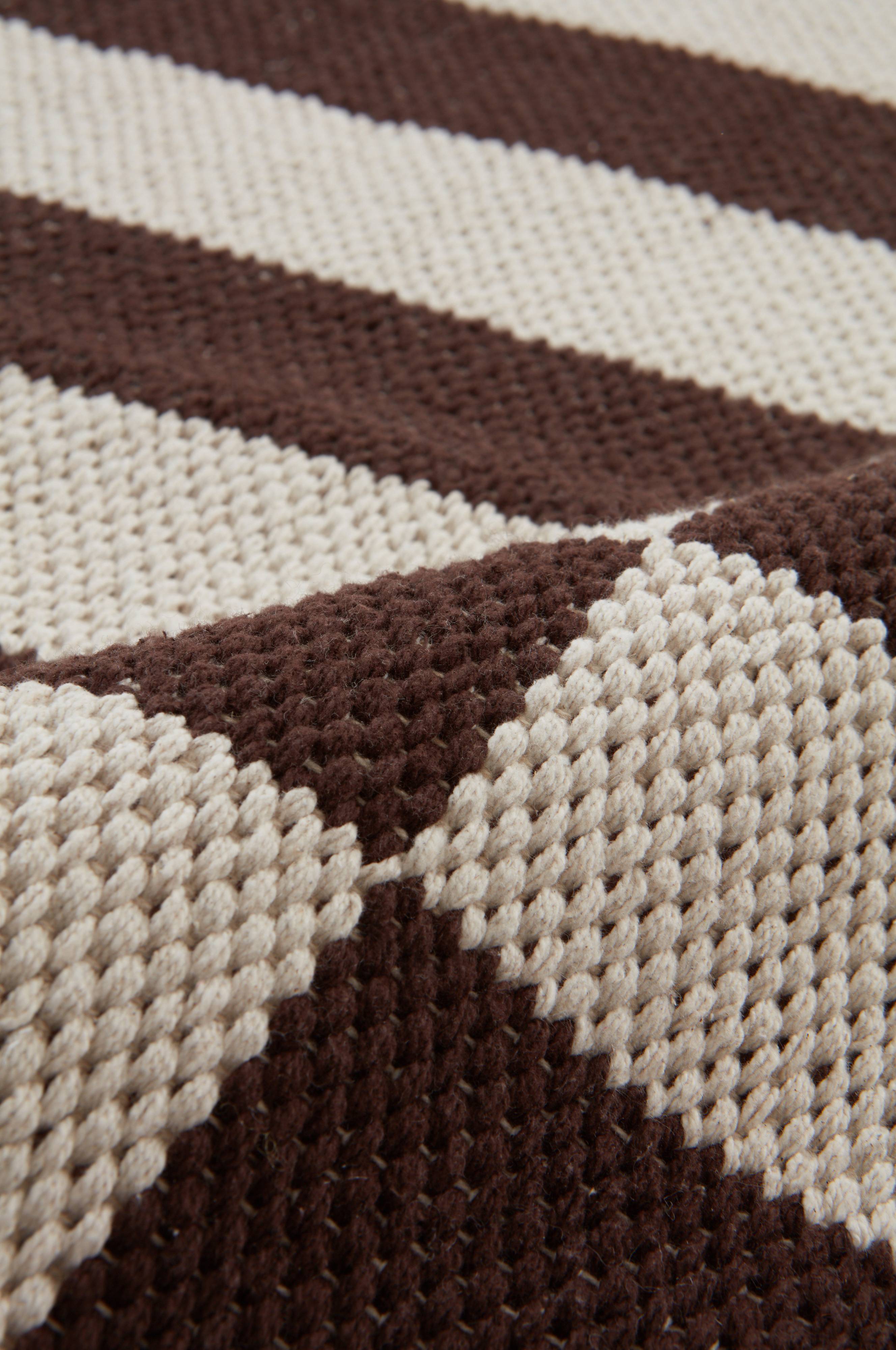 Håndvevd, glattvevd bomullsteppe med garnfarget mønster. Teppet har striper som skaper ruter og bred ensfarget bord langs kortsidene. Stabil, faldet kant langs kortsidene. Tykkelse 0,5 cm. 1200 g/m².
