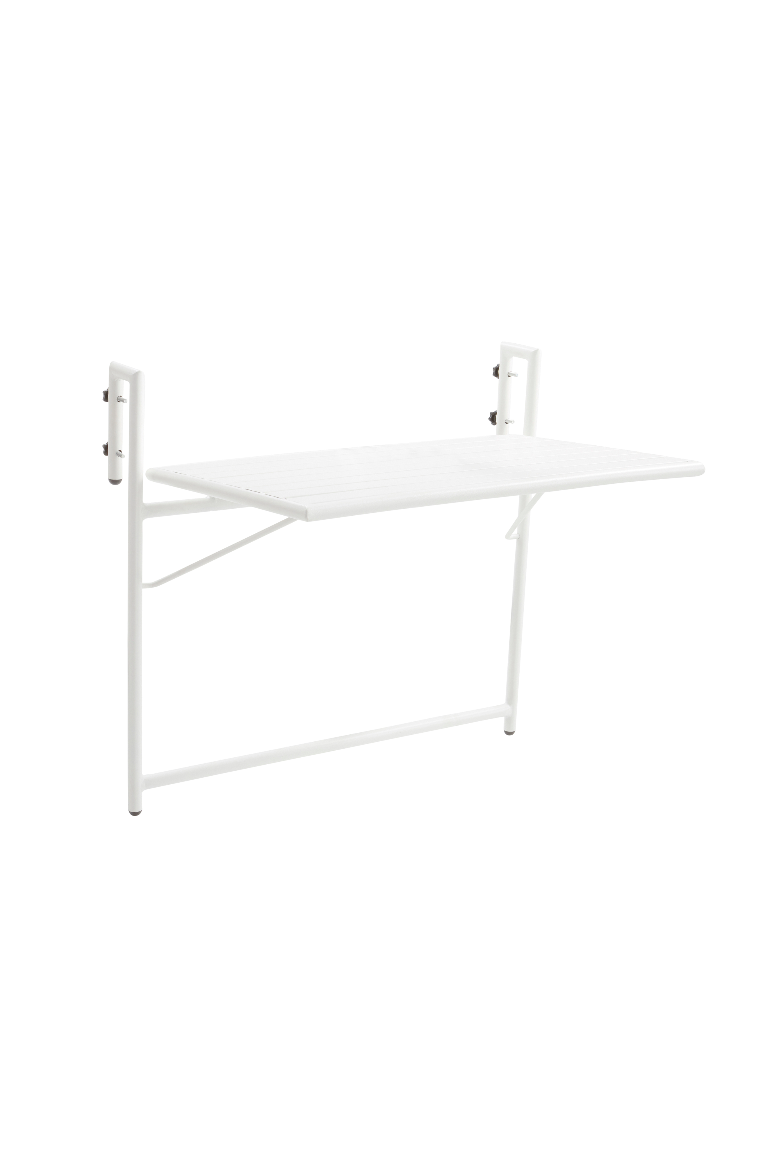 Balkongbord av pulverlakkert aluminium med matt overflate som ikke blender i solskinnet. Praktisk modell hvor du feller ut bordet når du trenger det. Ellers kan det henge nedfelt uten å ta plass. NAVONA tåler å henge utendørs på balkong- eller terrasserekkverket. Du slipper å bære så fort du vil sitte ute. Lav vekt.