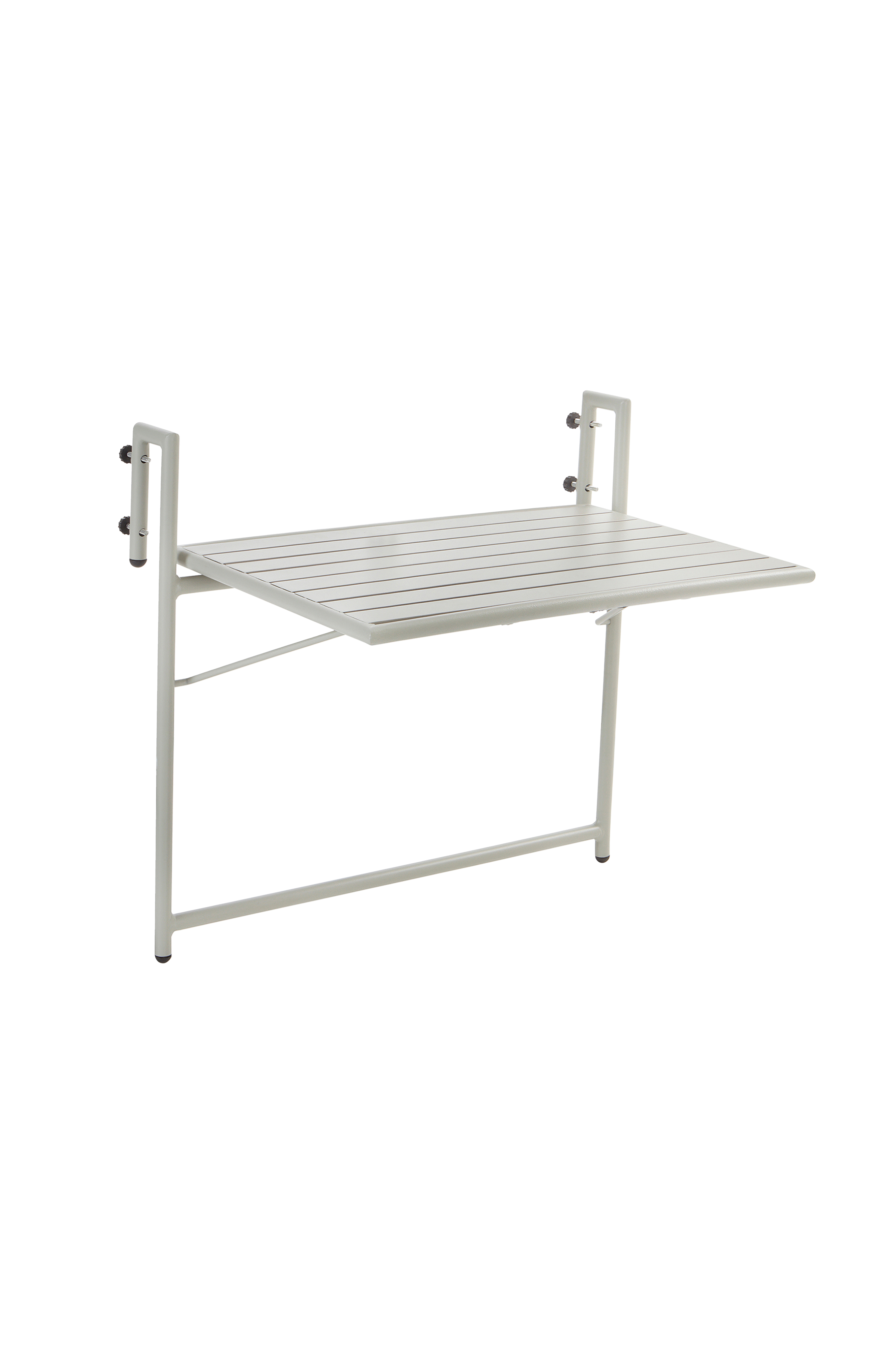 Balkongbord av pulverlakkert aluminium med matt overflate som ikke blender i solskinnet. Praktisk modell hvor du feller ut bordet når du trenger det. Ellers kan det henge nedfelt uten å ta plass. NAVONA tåler å henge utendørs på balkong- eller terrasserekkverket. Du slipper å bære så fort du vil sitte ute. Lav vekt.