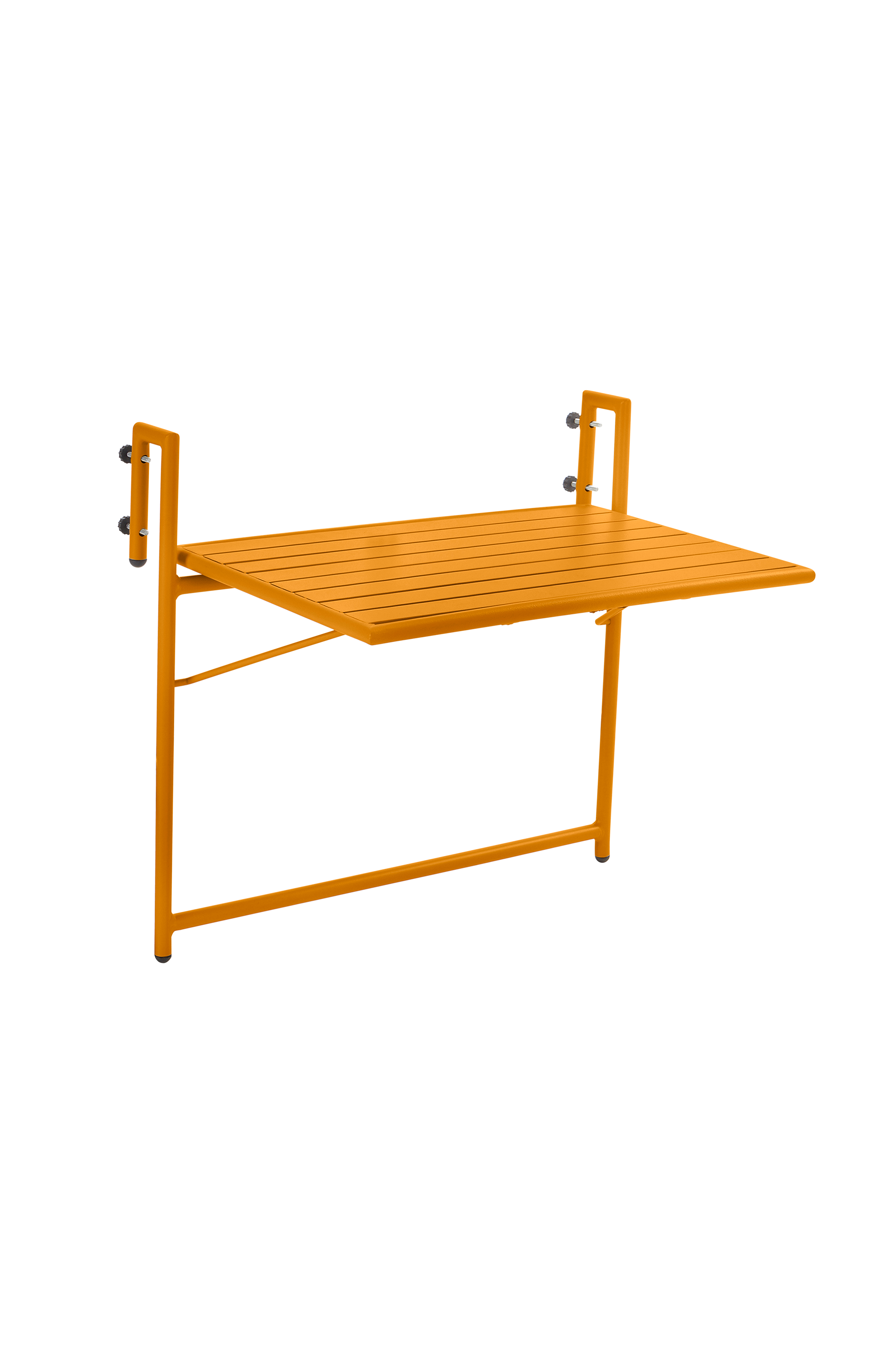 Balkongbord av pulverlakkert aluminium med matt overflate som ikke blender i solskinnet. Praktisk modell hvor du feller ut bordet når du trenger det. Ellers kan det henge nedfelt uten å ta plass. NAVONA tåler å henge utendørs på balkong- eller terrasserekkverket. Du slipper å bære så fort du vil sitte ute. Lav vekt.