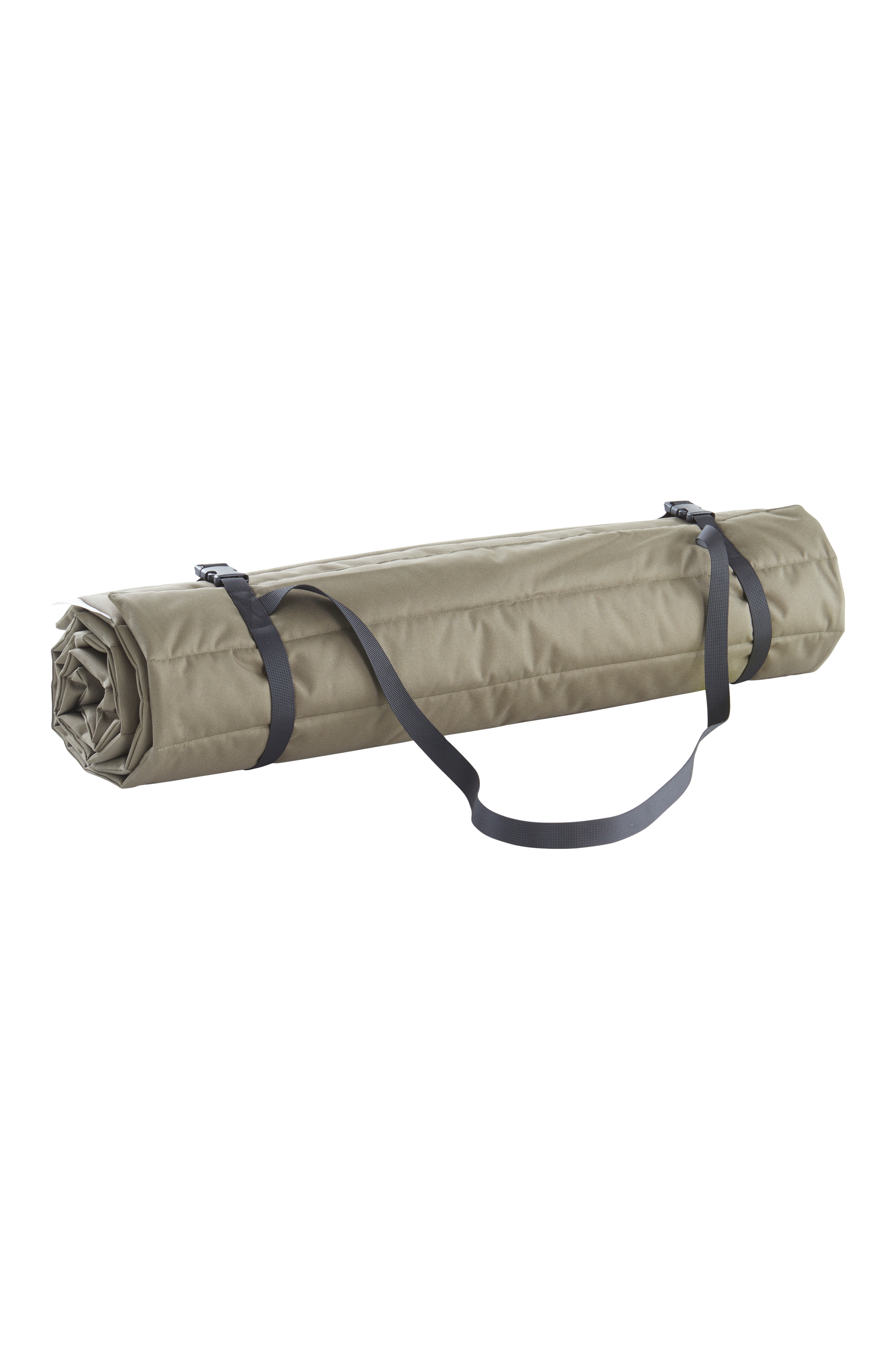 Strandmadrass med vannavvisende ytterstoff av polyester. Fyllet er også av polyester. Madrassen er kanalquiltet slik at fyllet holdes på plass. Den blir også lettere å rulle sammen. Bånd rundt som åpnes og lukkes med justerbare hurtigspensel av plast. Bærehåndtak gjør strandmadrassen enkel å ta med.