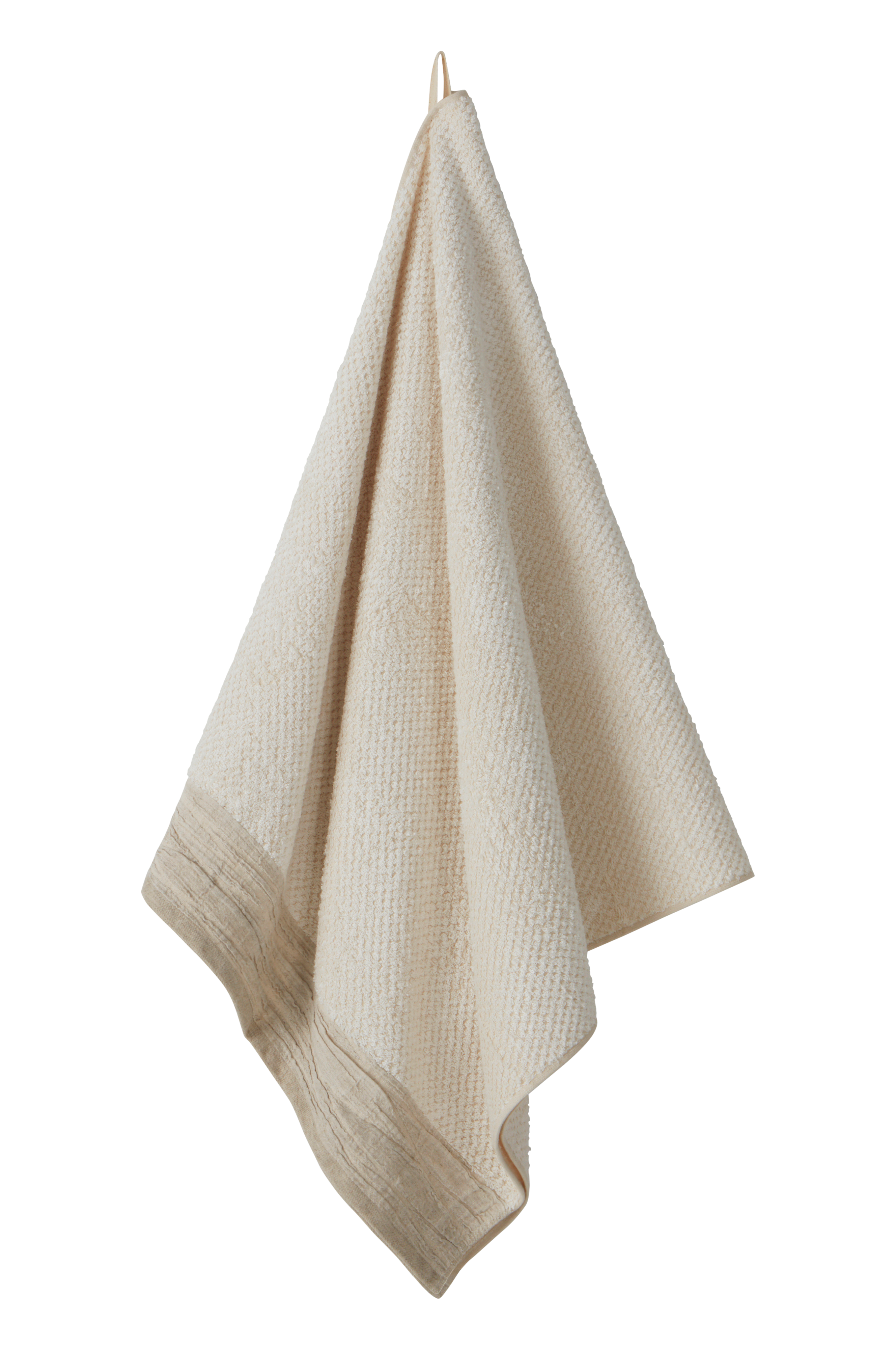 1-pk badehåndkle i herlig fin kvalitet av lyocell, bomull og lin i fin kombinasjon. Den herlige kvaliteten har jacquardvevd, diskre mønster og vakker vevd bord langs nederkanten. Den dekorative borden gir badehåndkleet en luksuriøs og forseggjort følelse. Frottéen har god absorberingsevne og fin glans. Frottéen er kraftig og myk, gramvekt 600 g/m².