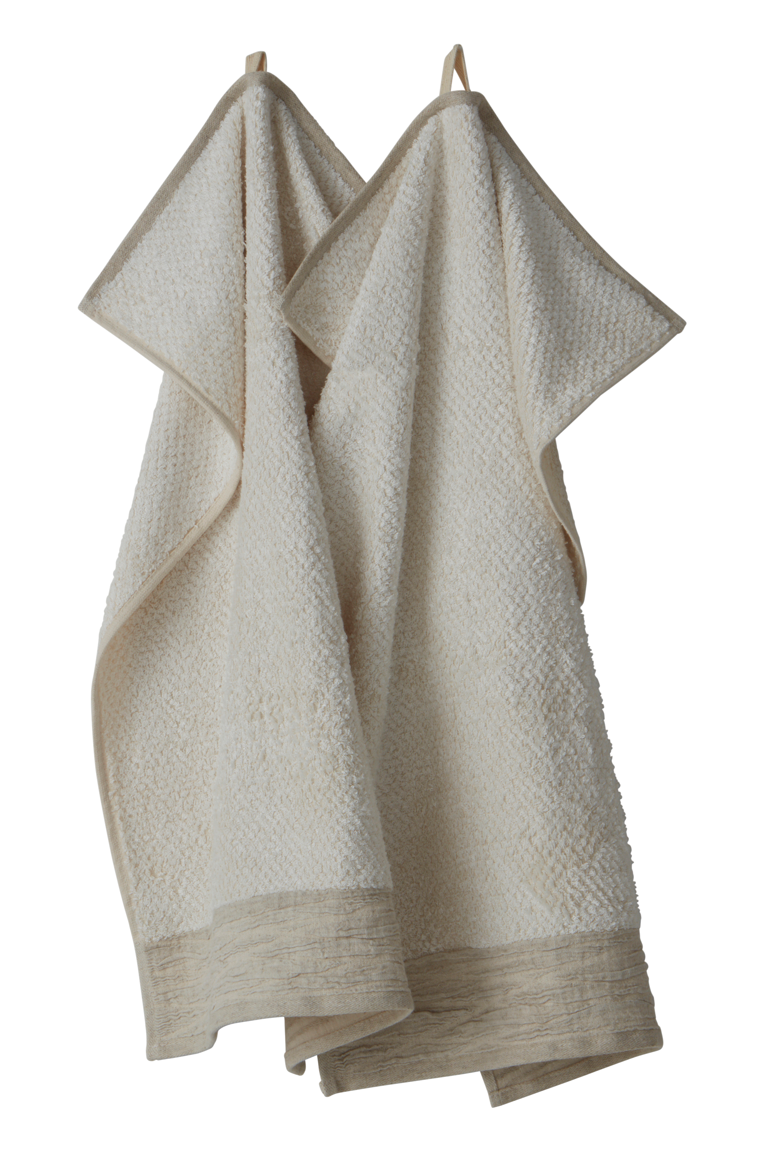 2-pk håndklær i herlig fin kvalitet av lyocell, bomull og lin i fin kombinasjon. Den herlige kvaliteten har jacquardvevd, diskre mønster og vakker vevd bord langs nederkanten. Den dekorative borden gir håndkleet en luksuriøs og forseggjort følelse. Frottéen har god absorberingsevne og fin glans. Frottéen er kraftig og myk, gramvekt 600 g/m².