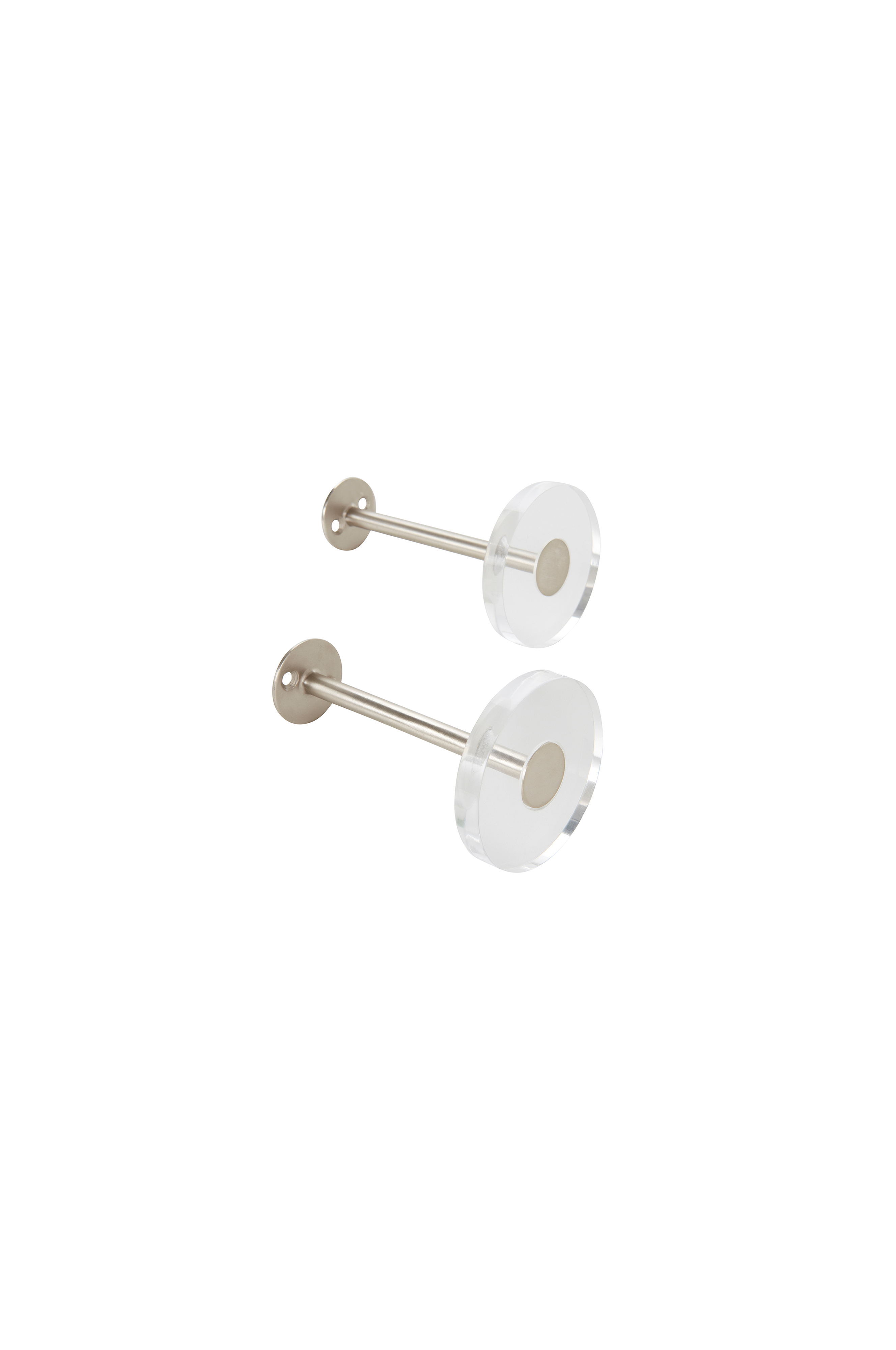 2-pk holdere av jern med en rund dekorplate av pleksiglass. Holderen er smidig og diskre og fremhever gardinen din på en pen måte. Skruer og plugg inngår.