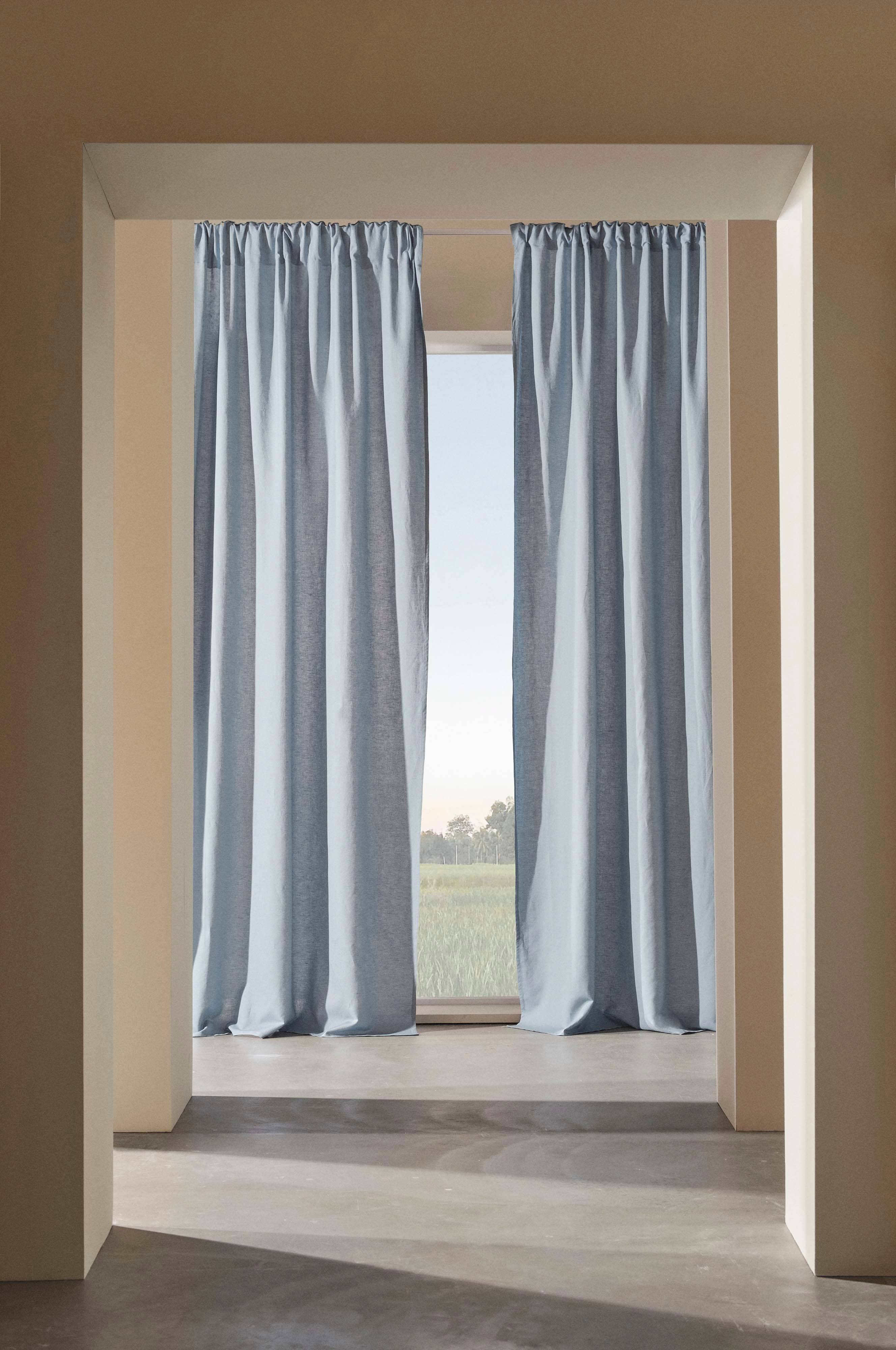 To gardinlengder i lin- og bomullsblanding, ensfarget i flere naturnære farger. I det enkle bor det vakre. Lengdene har påsydd multifunksjonsbånd, og kan henges opp med fingerkroker, kanal samt skjult hempe. Blandingen av bomull og lin gir en lettstelt kvalitet med fordeler fra både bomull og lin. Linet fører med seg den litt fastere teksturen, og sammen med den myke bomullen blir stoffet smidig og faller fint.