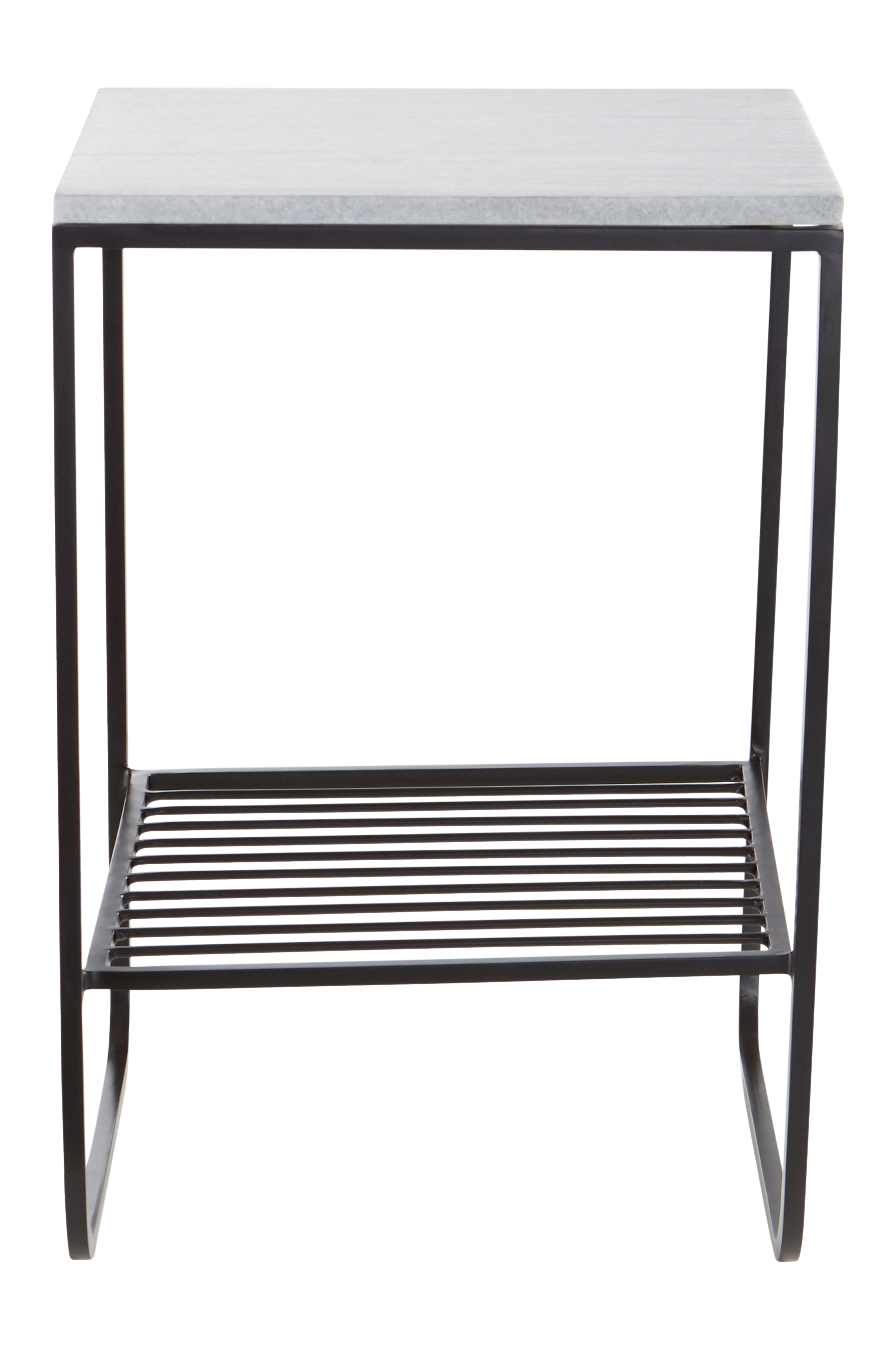 Sidebord i jern med mattlakkert overflate. Bordet har en fin bordplate av marmor og en hylle under som gir praktisk oppbevaring. Det gjør seg fint ved siden av sofaen i stua, men er også et utmerket nattbord. Stammen er av firkantprofil og bena er dekorative der de gjør en avrundet sving slik at bordet står som på meier. Marmor er en naturstein, og mønsteret varierer alltid litt avhengig av bergartens sammensetning. Dette gjør hvert møbel unikt.