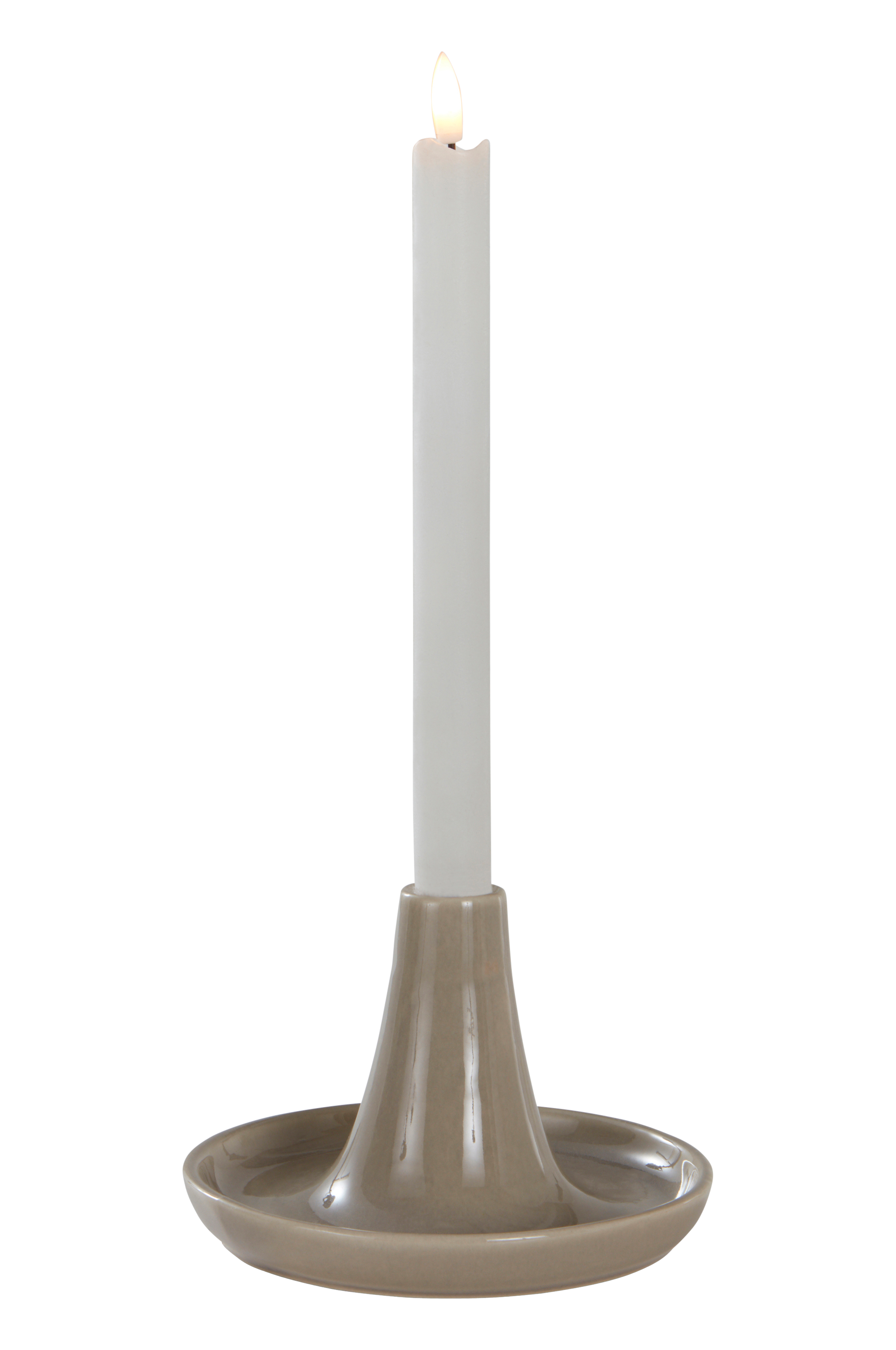 Håndlaget lysestake av keramikk. Lysestaken er vakker og enkel i formen, og er glasert i en fin nyanse. Lysestaken smelter fint inn i gammeldagse rustikke omgivelser, og gjør seg også fint i en moderne, nedtonet stil. Den praktisk avrundede basen samler opp stearinen hvis det skulle renne litt slik at det ikke kommer flekker på duken eller bordet. Det fine håndverket gjør hver lysestake unik.