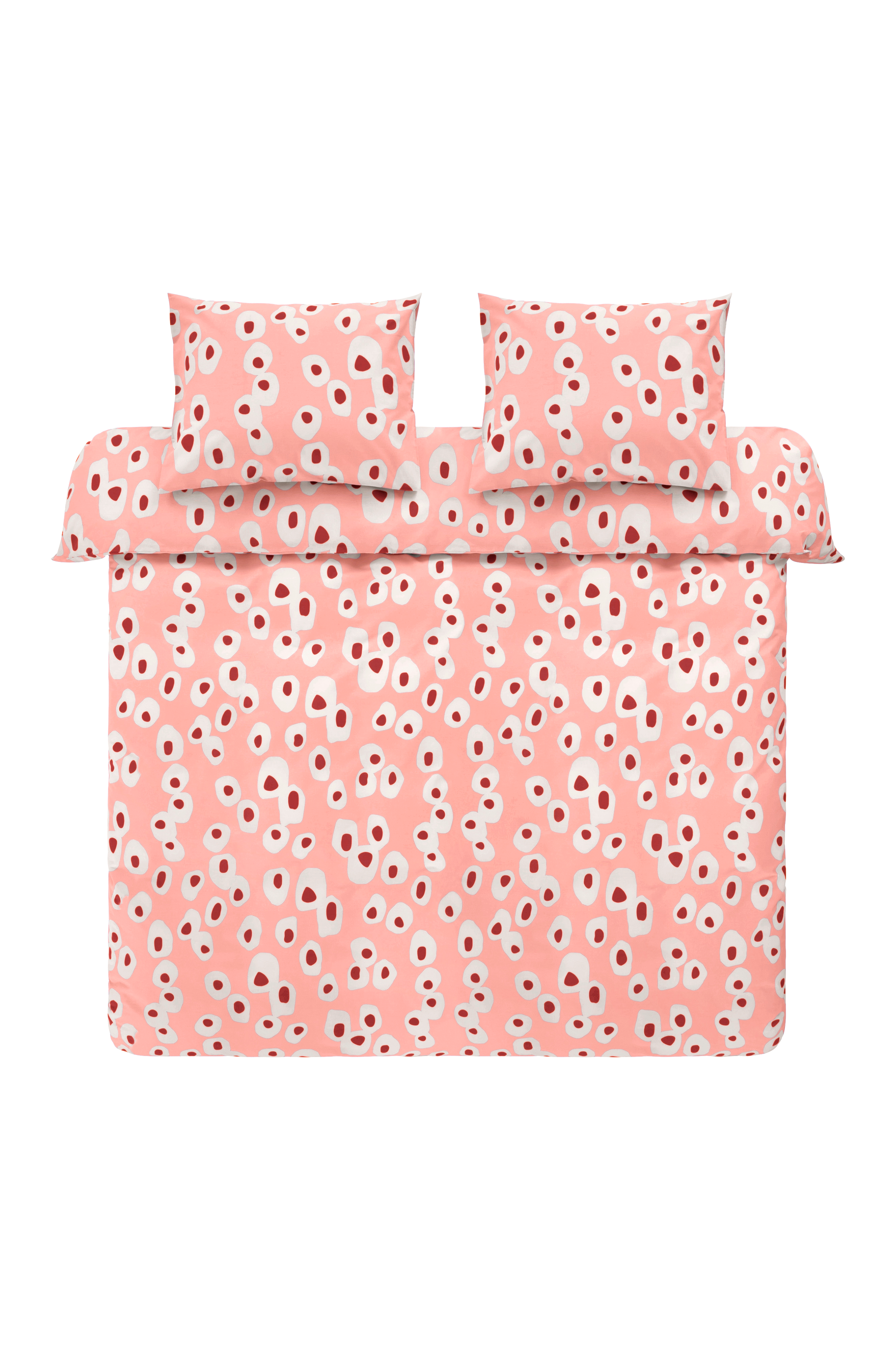 OVO dobbeltsengsett med et unikt mønster av Maria Carlberg, som tilfører soverommet ditt en leken retrostemning med sitt speilegginspirerte design. Settet inneholder et ekstra bredt dynetrekk og to putevar, alle laget av økologisk bomull for komfort og kreativitet.
