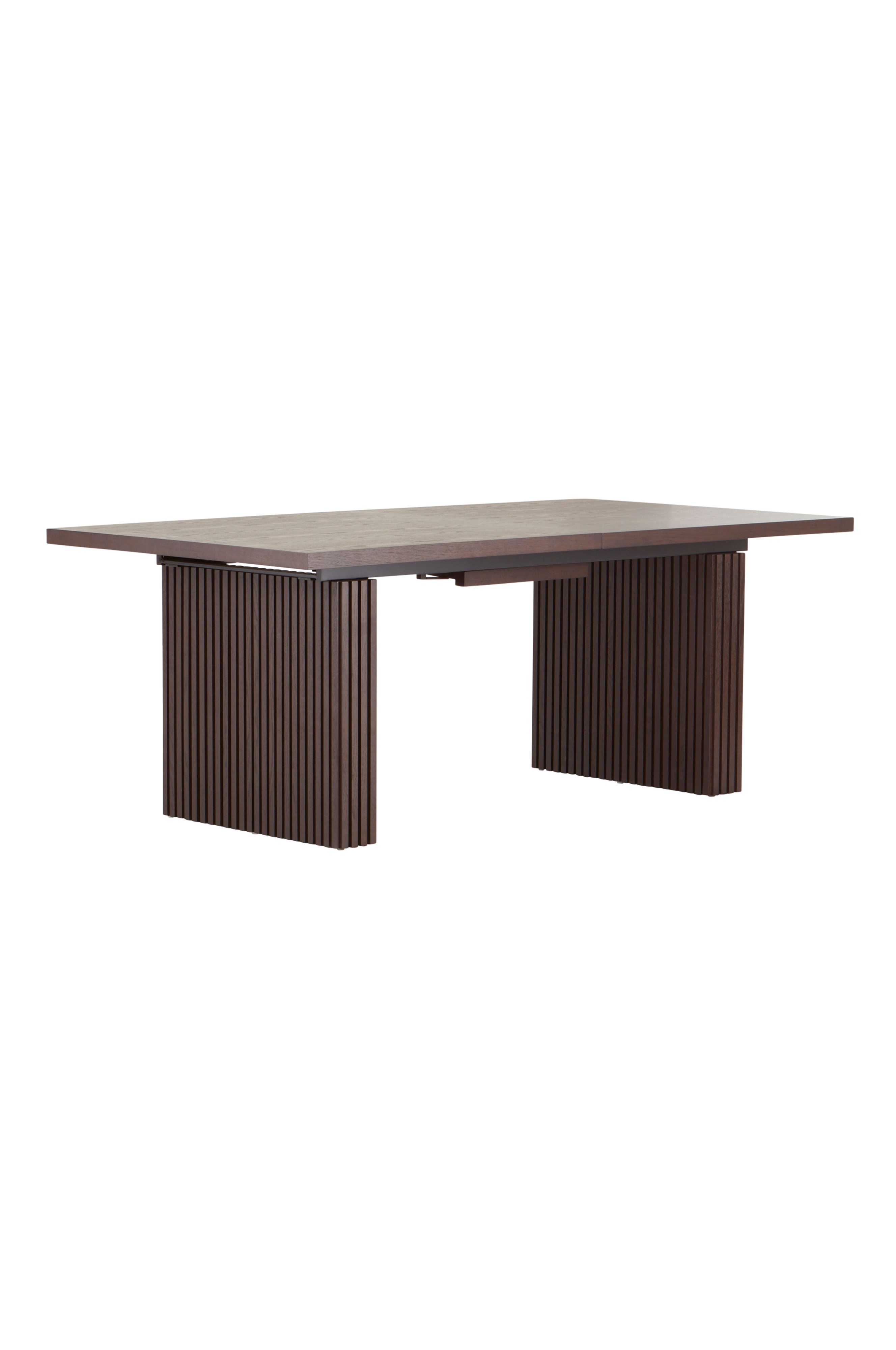 Spisebord i MDF med askefinér. Det solide spisebordet har praktisk uttrekksfunksjon med ileggsplate som gir deg plass til flere når venner stikker innom. Ileggsplaten legges ned og oppbevares i bordet når den ikke brukes, praktisk og enkelt. De to robuste bordbena har utfreste, vertikale striper som gir en klassisk følelse med retroinnslag. Bordet er stort og stilrent med kantet bordplate og mykt avrundede hjørner på bena. PALANZO er et fleksibelt og stilfullt bord som gir rommet attityde. Skruer inkludert. Noe montering kreves.