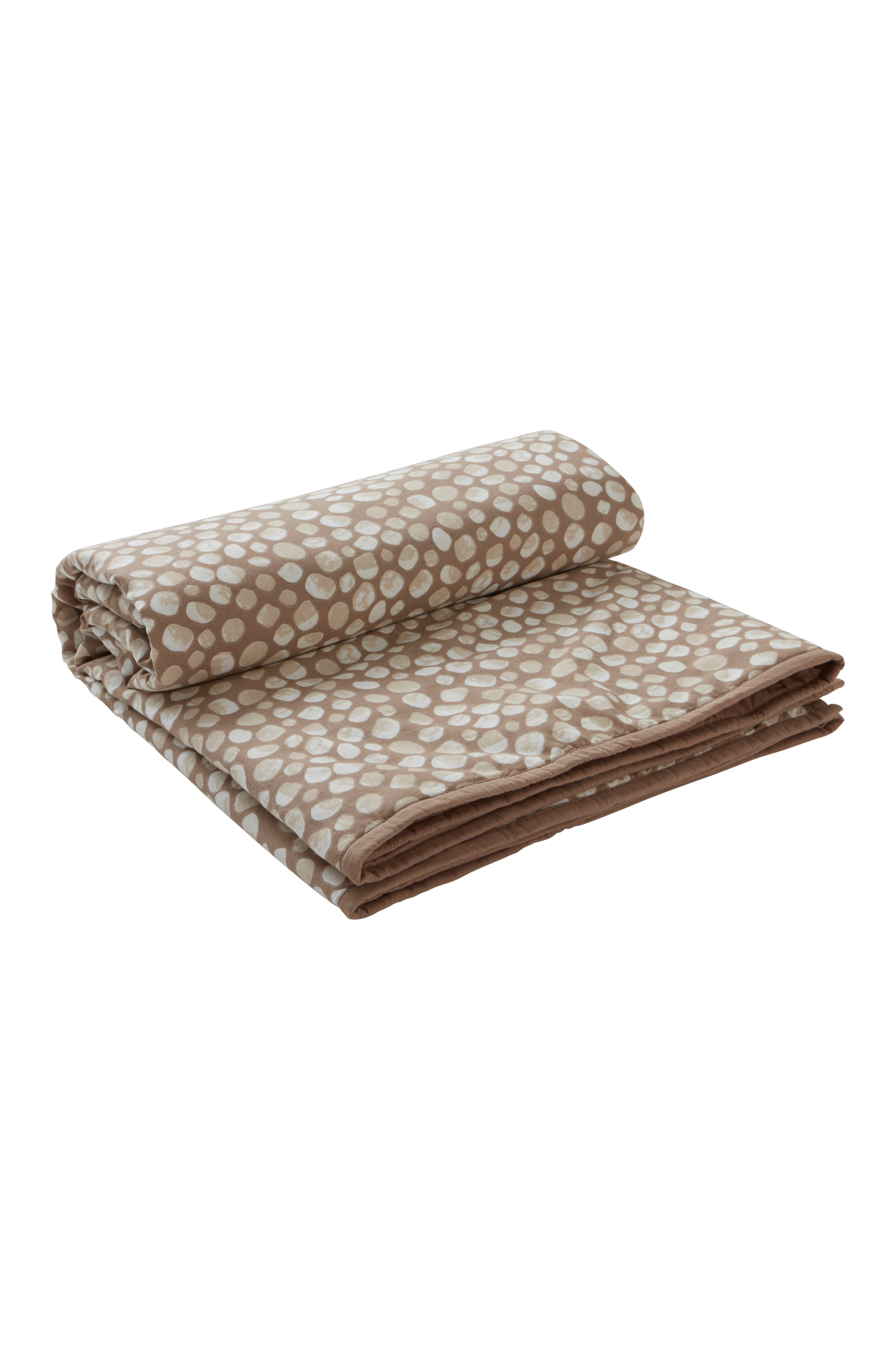 Vendbart pledd av bomull med lett vattering av polyester. Det deilige, vendbare pleddet har en side med trykt mønster som minner om runde steiner, og en ensfarget side. Lett vattering gjør pleddet ekstra herlig og varmt.