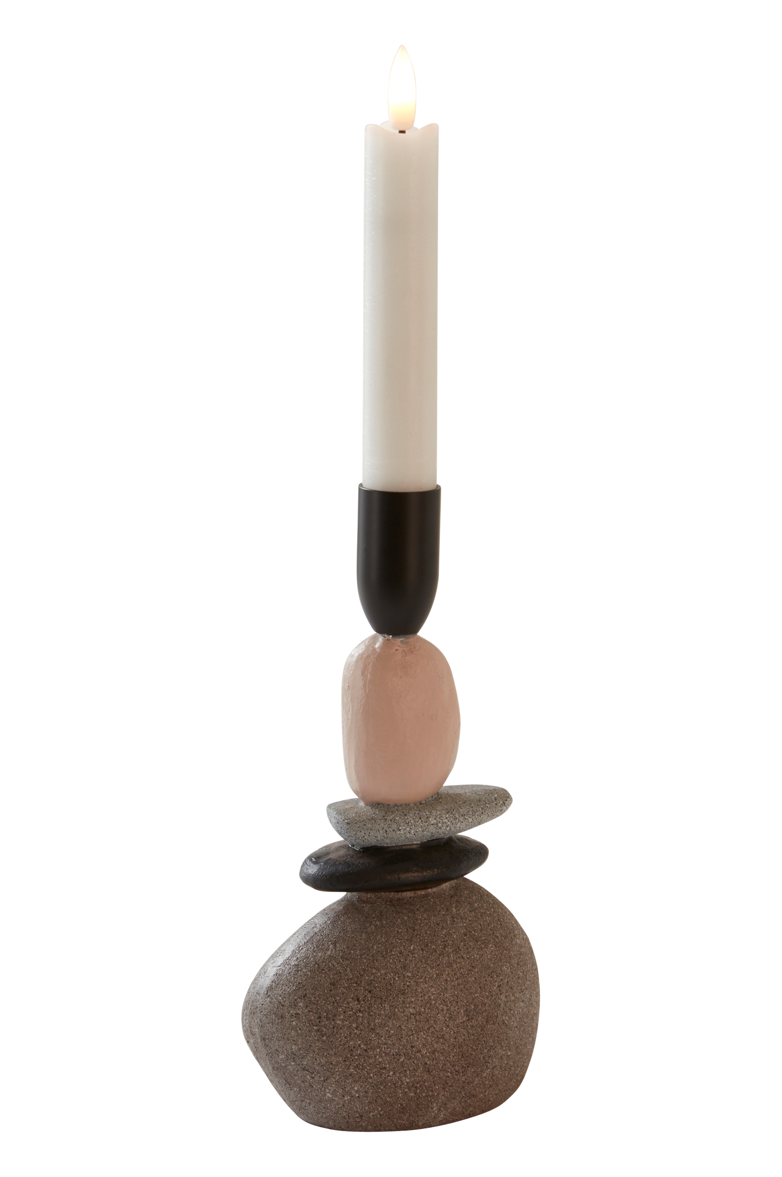 Lysestake av steiner som er stablet i høyden. På toppen er det en lysholder til levende lys eller batteridrevet lys. Lysestaken er av polyresin, og steinene er fine og virkelighetstro. Lys medfølger ikke.