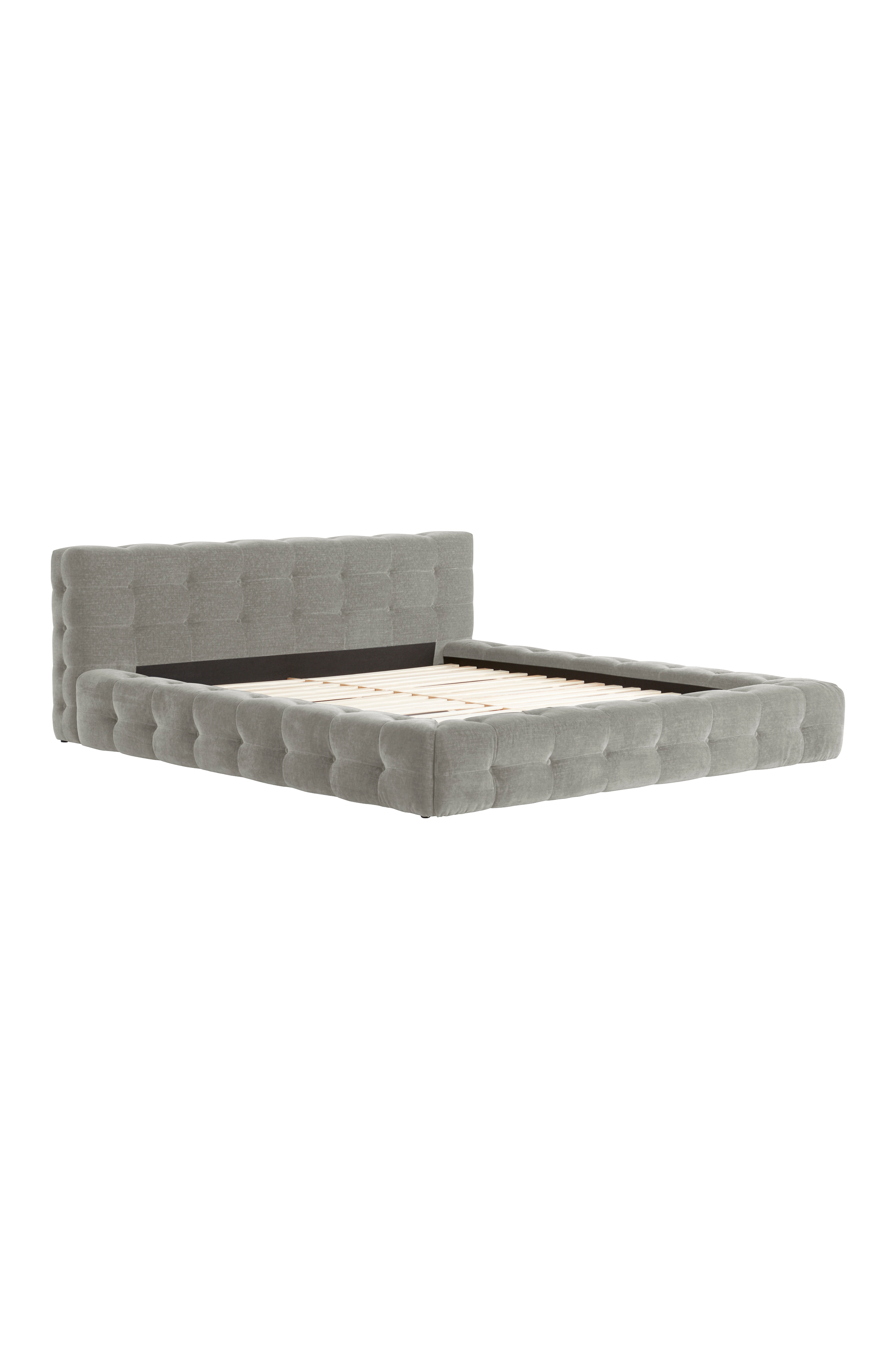 Sengeramme som er fantastisk innbydende og veldig sjenerøs i formen. Både hodegavlen og rammen rundt den er mykt polstret og polstret med et mykt polyester chenille-stoff som har dype sydde knapper. Sengen er luksuriøs og elegant. Rammen rundt sengen går nesten helt ned til gulvet, bare et lite luftgap er igjen som gjør at luften kan sirkulere under sengen. Rammen er laget av FSC-sertifisert furu og kryssfiner. Sengerammen har en ribbet kryssfinerbase, og du utfyller den med madrasser eller boksmadrasser, avhengig av hva du foretrekker.