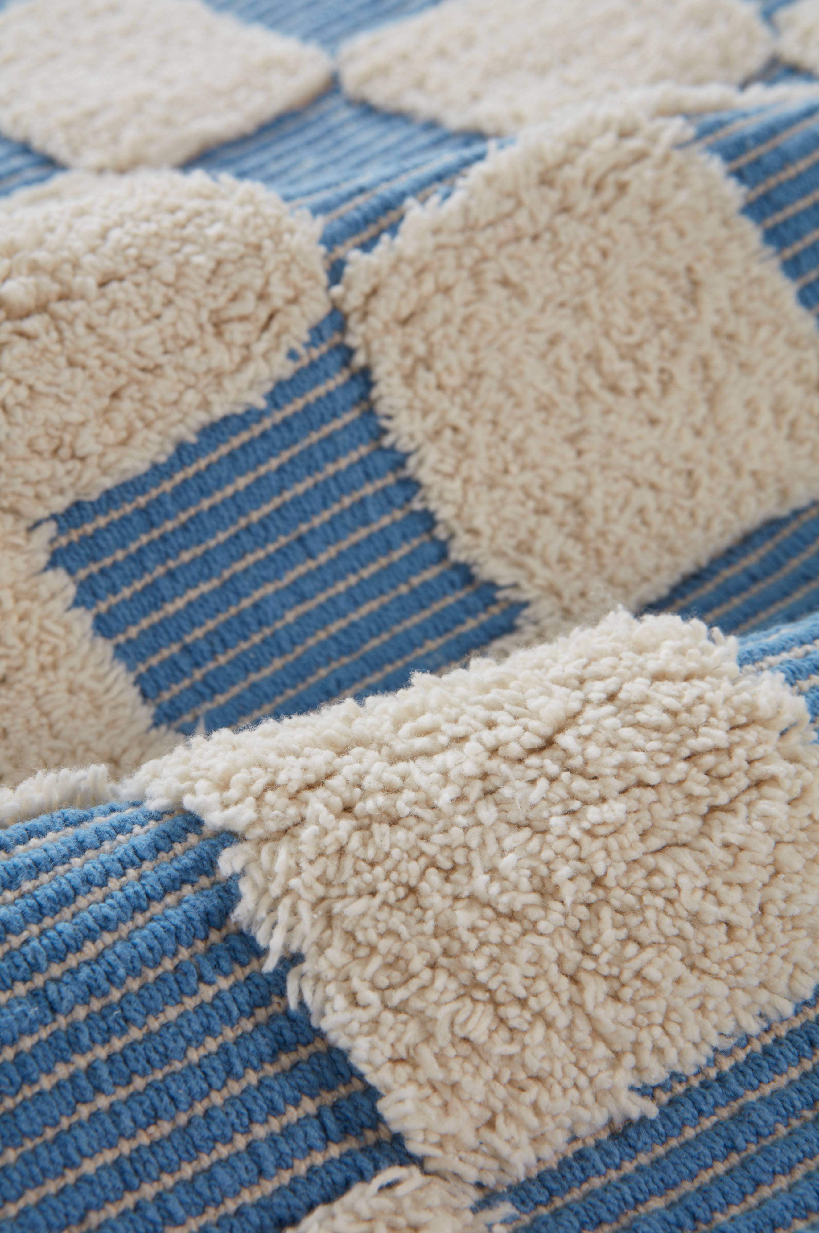 Håndvevd bomullsteppe der veveteknikken og garnfargen skaper et lekkert rutemønster. Det fine håndverket gjør hvert teppe unikt. Teppet er mykt og behagelig. Lugghøyde 0,6 cm. Tykkelse 0,8 cm. 1722 g/m².