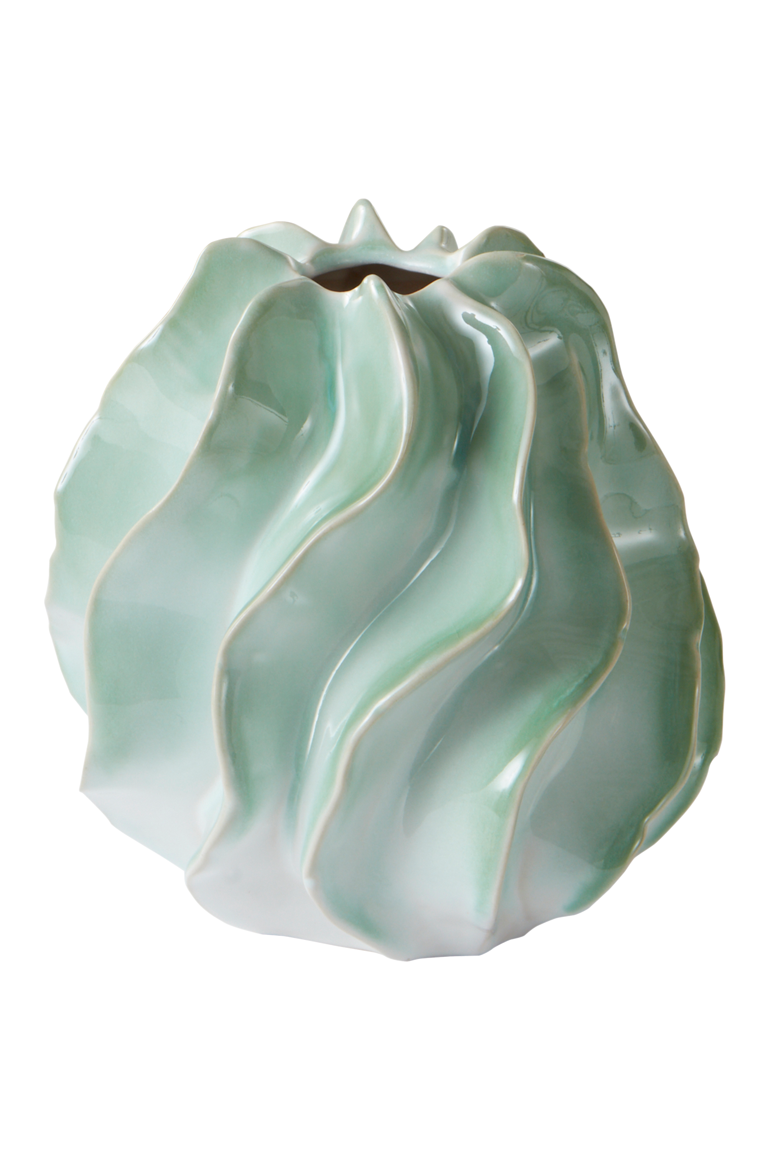 Håndlaget dekorvase av glasert keramikk. PEYTON er bølgende i formen, og sammen med den vakre glasuren minner vasen om havets koraller. Innsiden er også glasert. Håndverket gjør at hver vase er unik. Husk at keramikk kan slippe gjennom fukt.