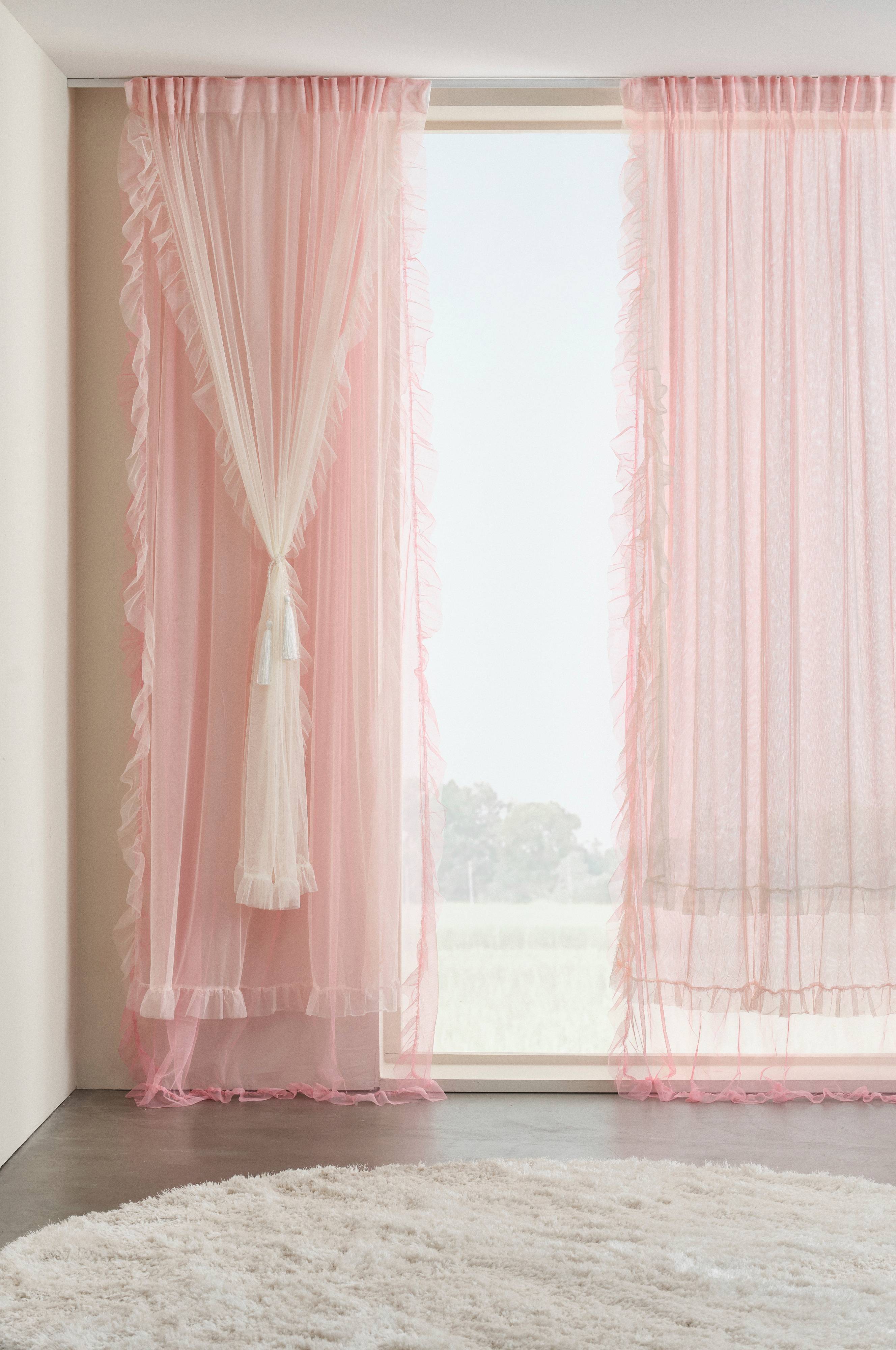To gardinlengder i tynn, transparent polyester med volangkant langs sidene. Hver lengde består av tre lag stoff i ulike fargenyanser. Det gir en herlig effekt, og de fine gardinene føles luftige. Lengdene har påsydd multifunksjonsbånd øverst. Gardinen kan henges opp med fingerkroker, løpegang samt skjulte hemper.