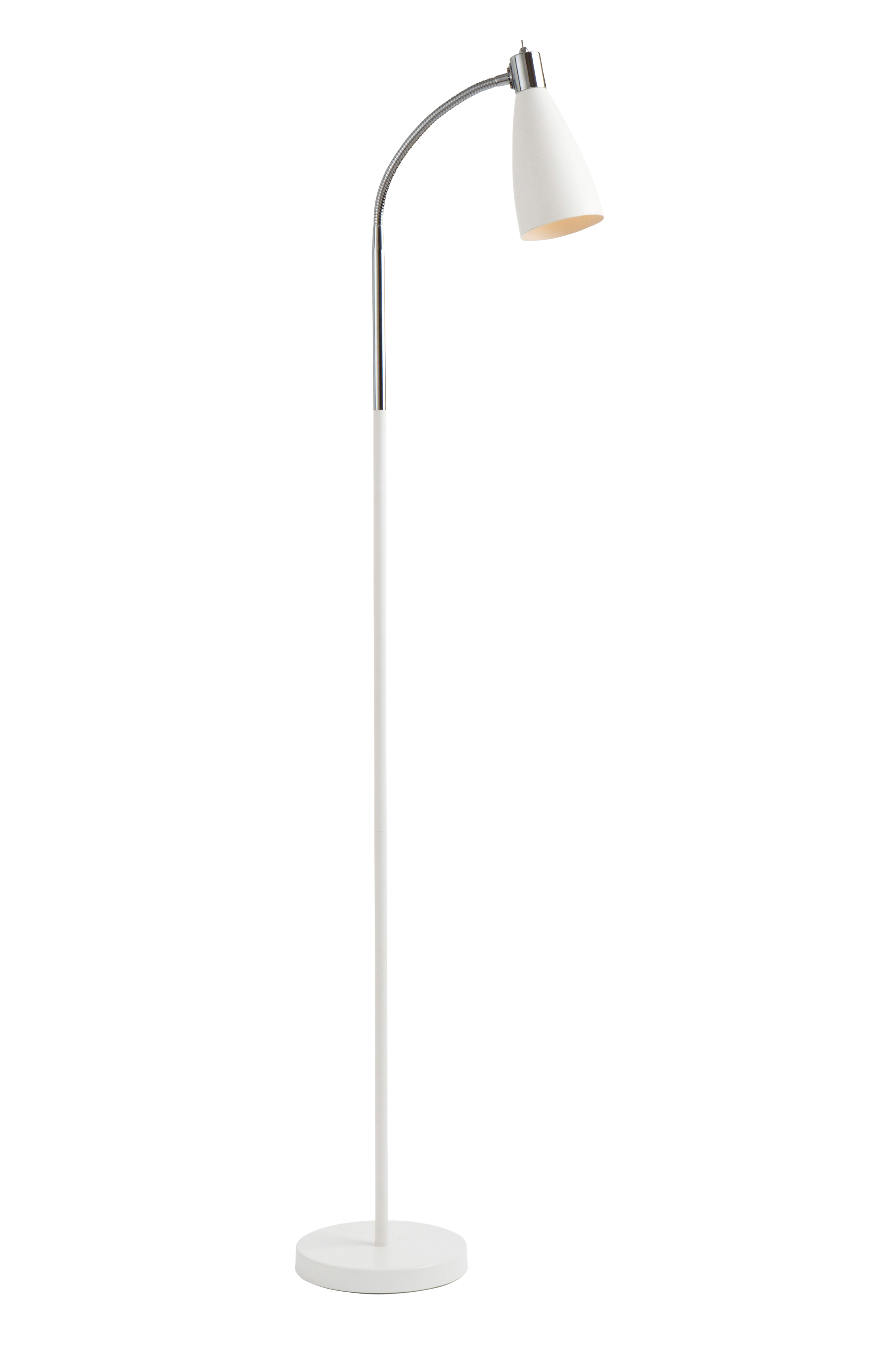 Gulvlampe med bøybar arm og med strømbryter på skjermen. Transparent ledning 170 cm.